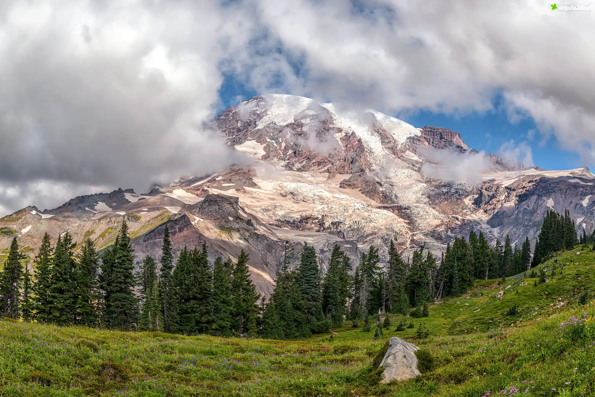 Zdjęcie Drzewa, Świerki, Kamień, Góry, Mgła, Niebo