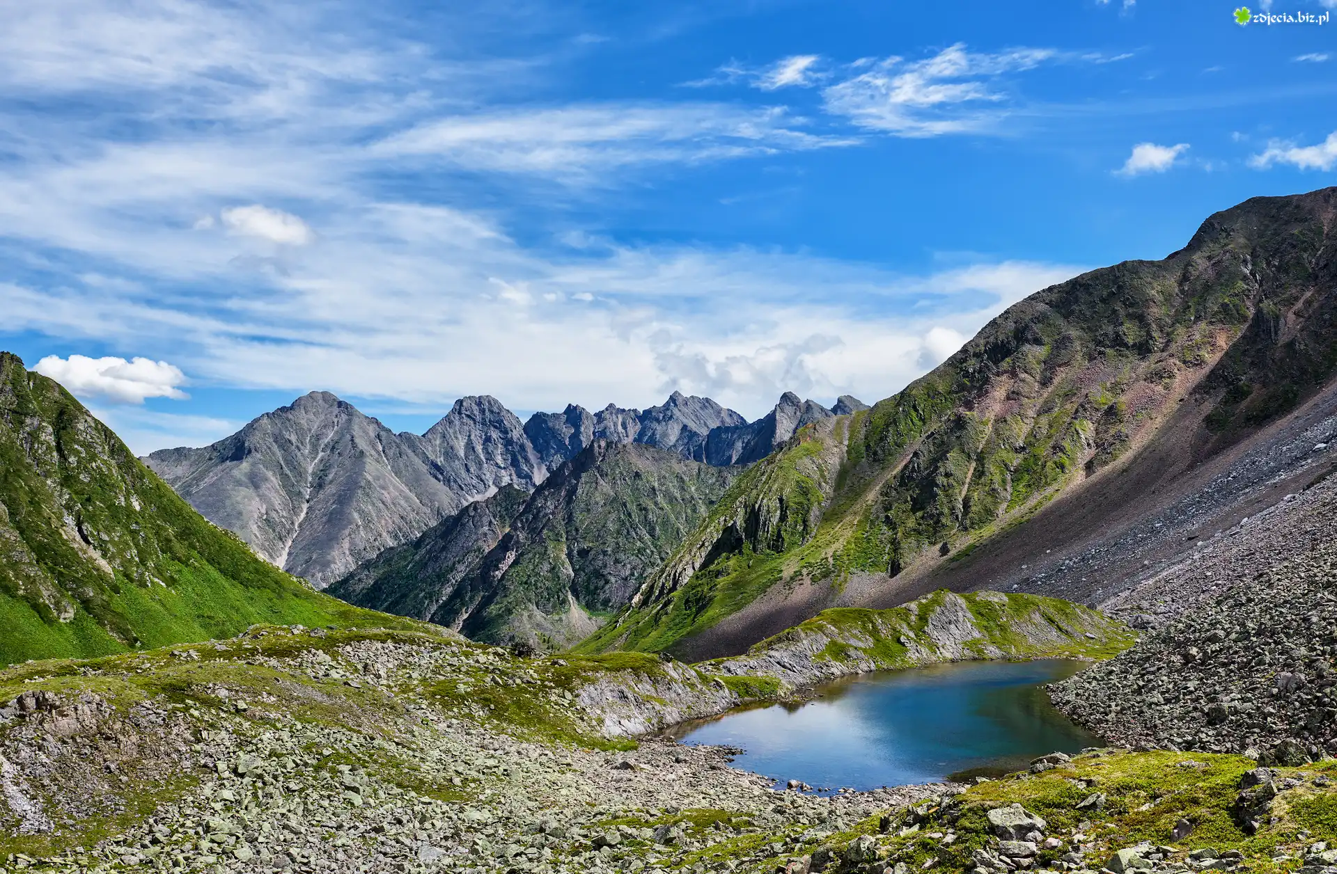 Zdjęcie Góry, Jezioro, Kamienie, Błękitne, Niebo, Chmury