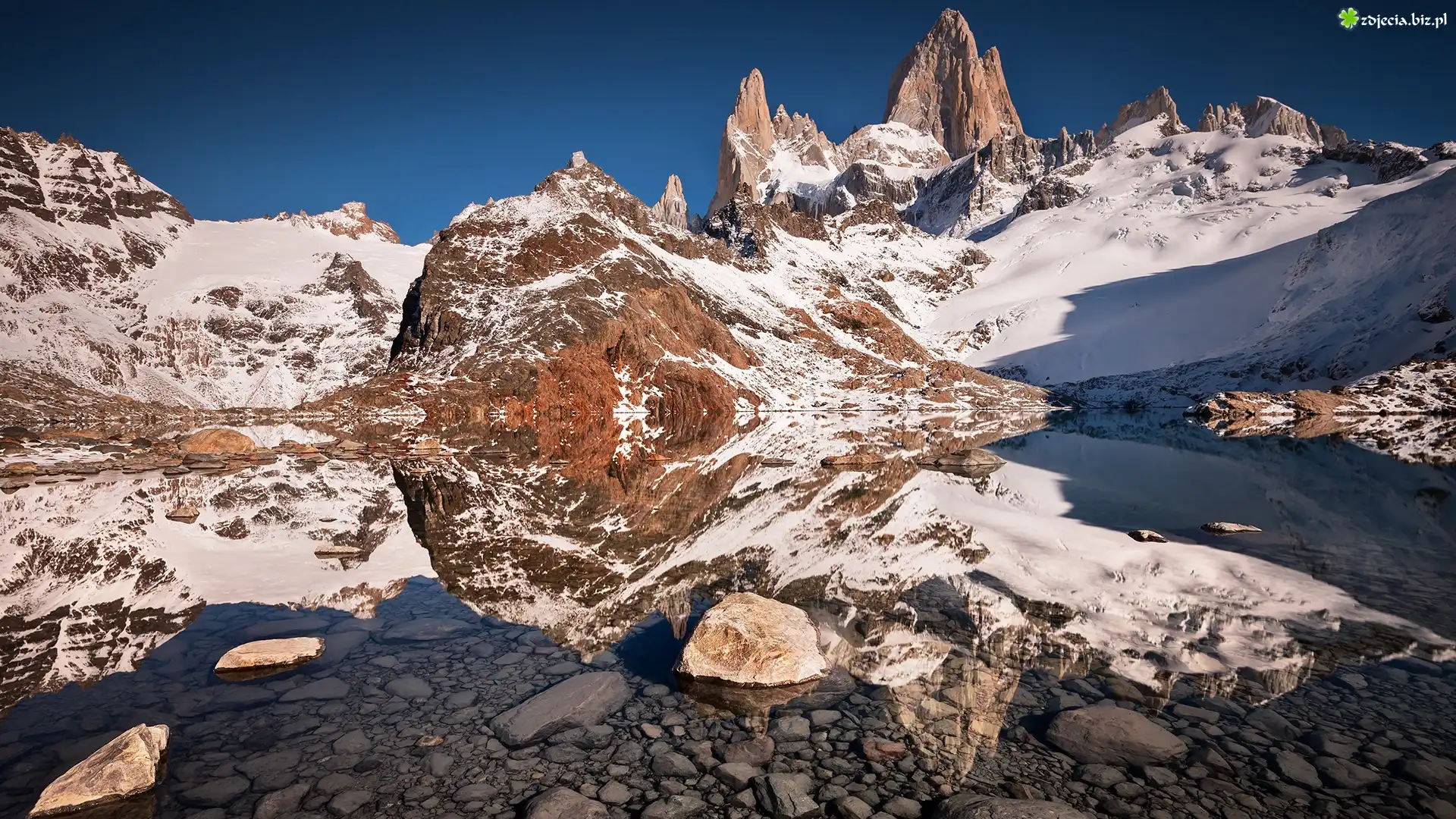 Zdjęcie Niebo, Góry, Śnieg, Skały, Rzeka, Woda, Kamienie