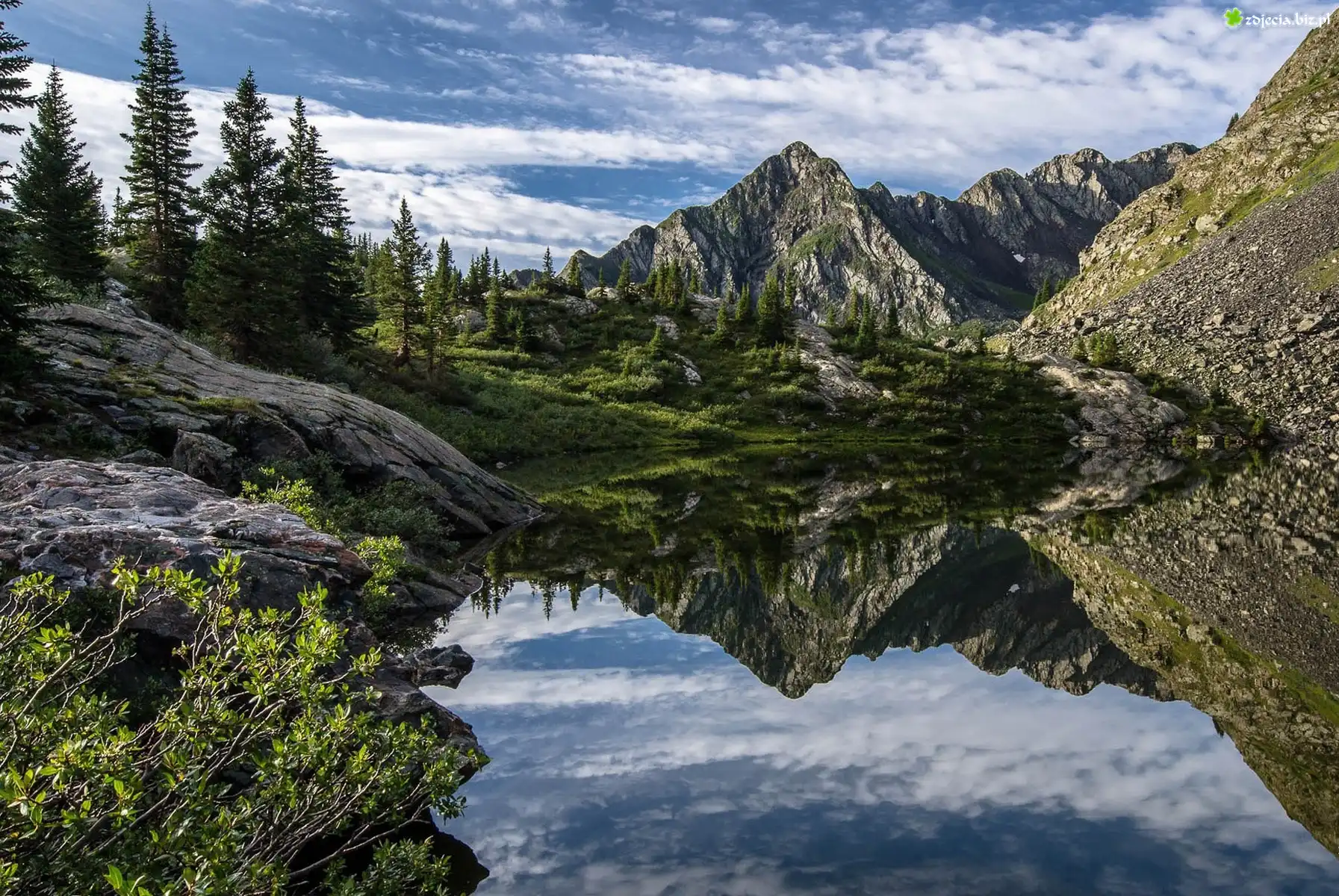 Zdjęcie, Góry, Drzewa, Woda, Niebo, Odbicie