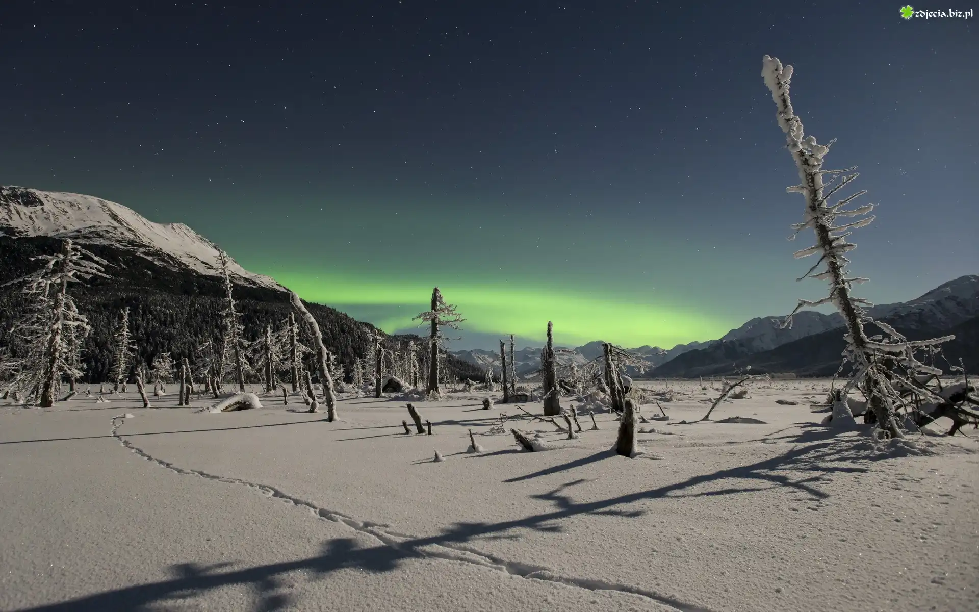 Zdjęcie Góry, Drzewa, Śnieg, Gwiazdy