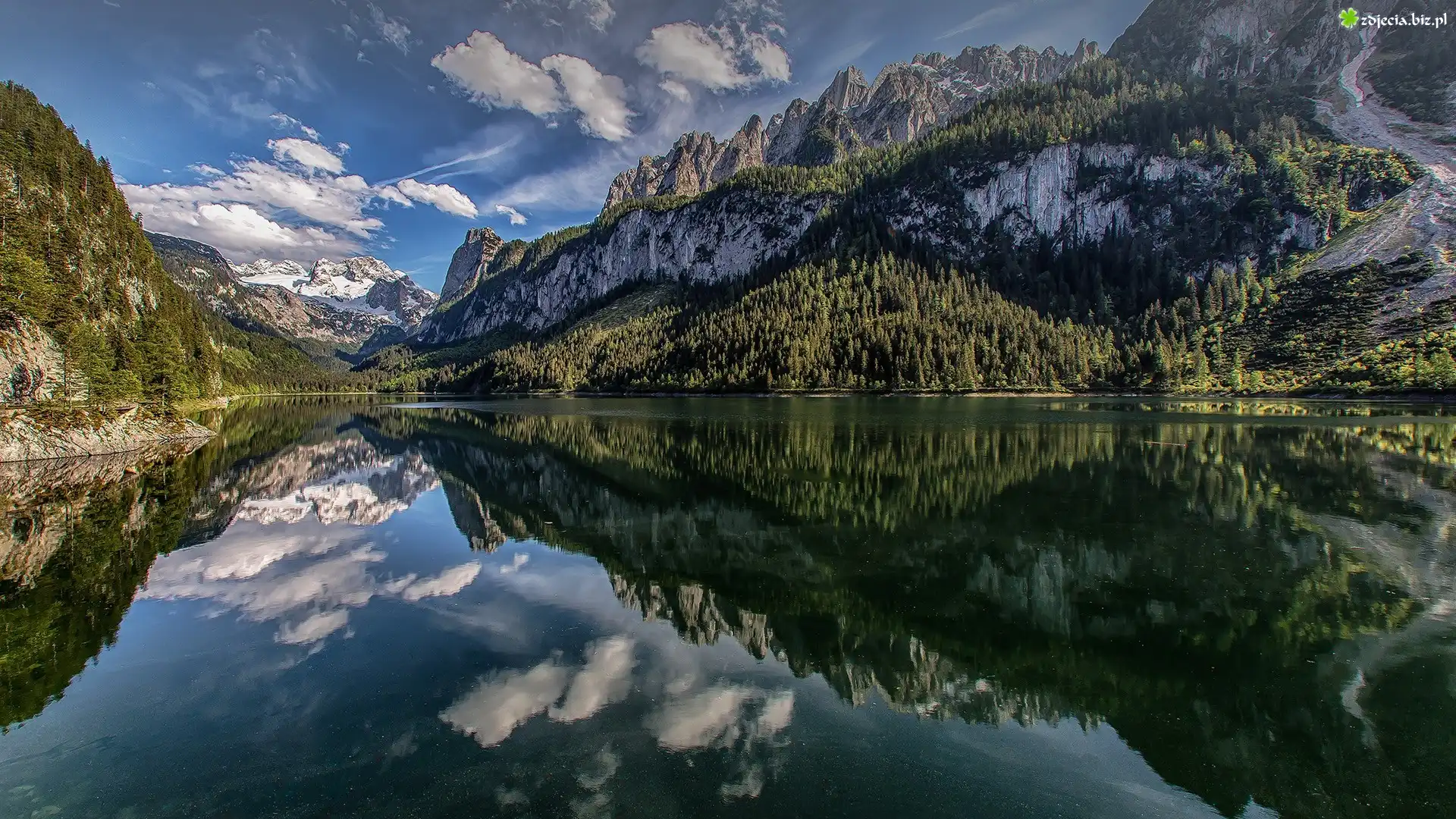 Zdjęcie Austria, Góry Dachstein, Jezioro Gosau, Drzewa, Chmury, Odbicie