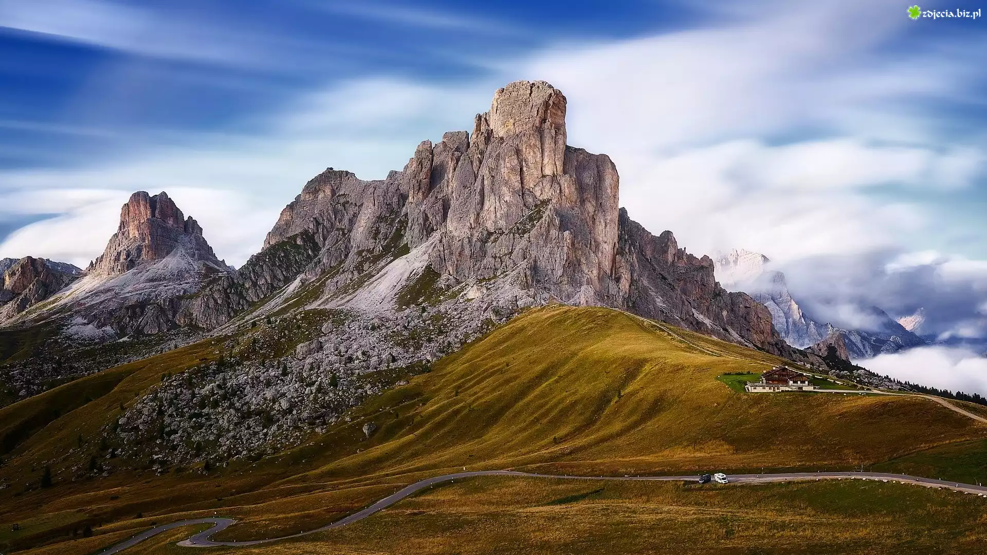 Zdjęcie Góry, Dolomity, Droga, Skały, Schronisko, Przełęcz, Passo Giau, Włochy
