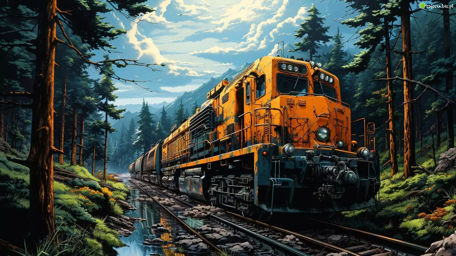 Zdjęcie Grafika, Las, Pociąg, Lokomotywa, Spalinowa, Tory, Rośliny, Góry