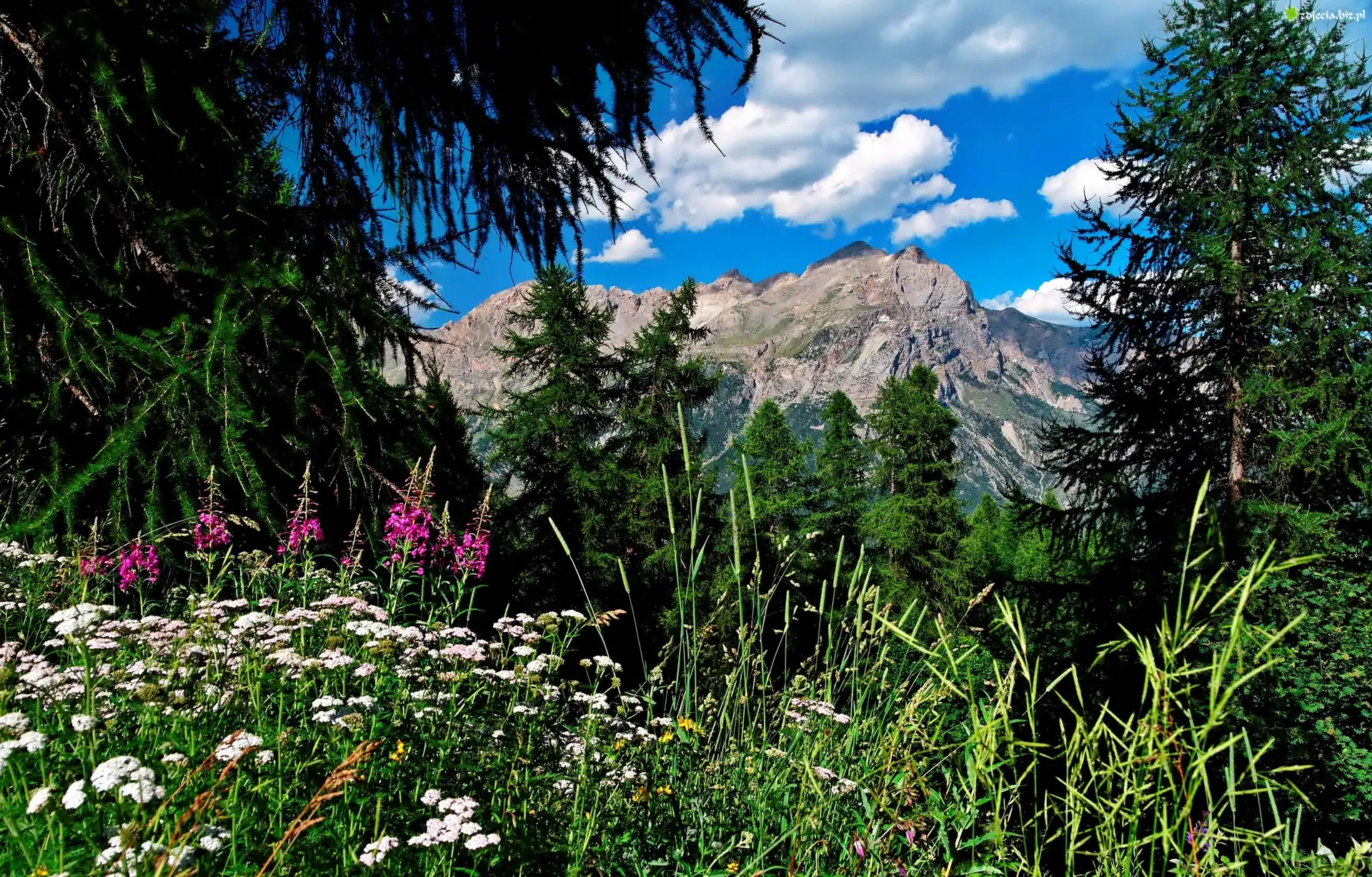 Zdjęcie, Góry, Obłoki, Świerki, Polne, Kwiaty