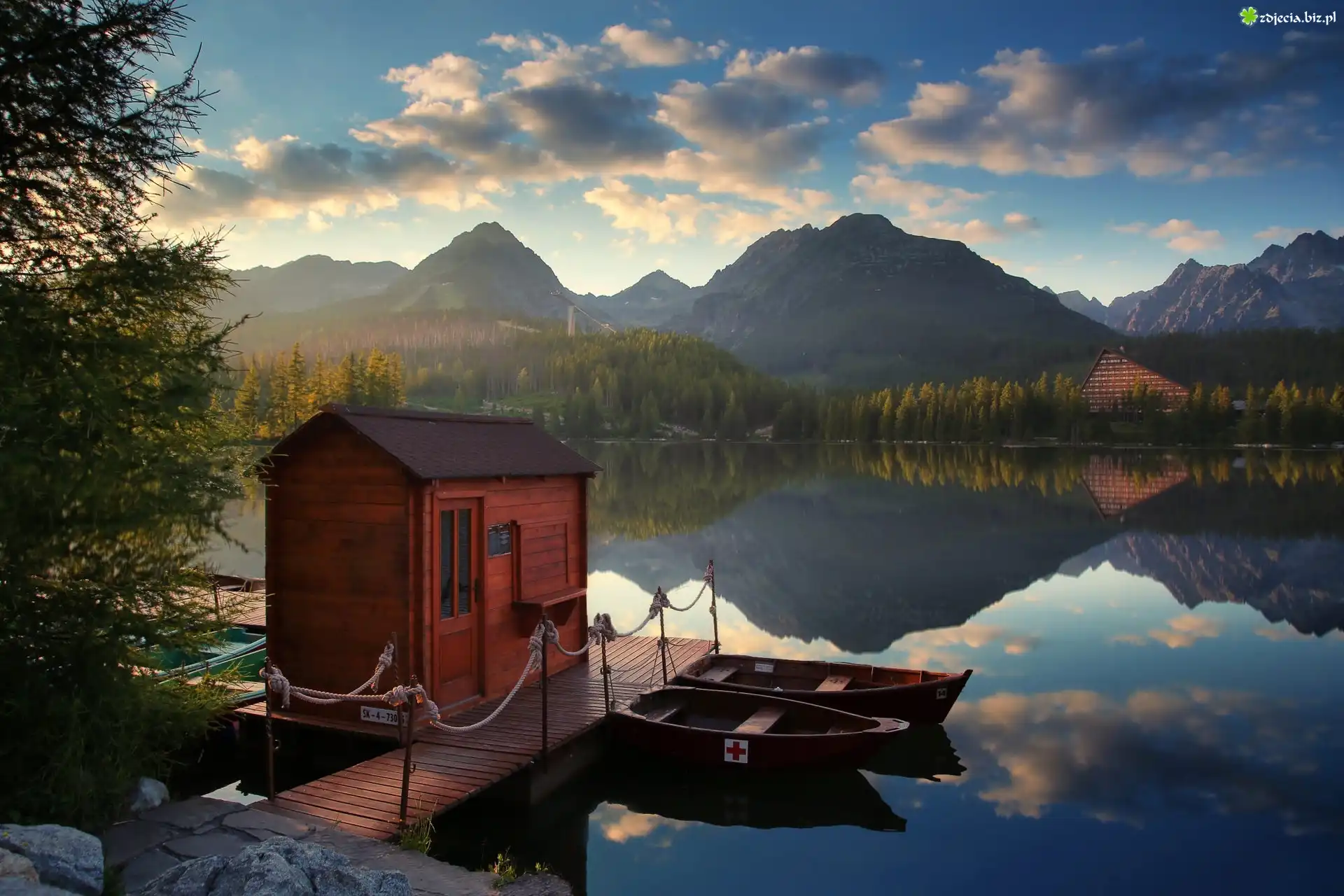 Zdjęcie, Góry, Jezioro, Przystań, Domek, Pomost, Łódki