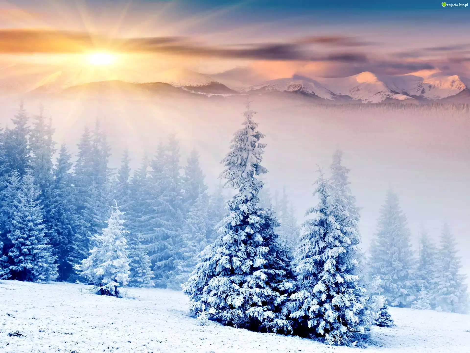 Zdjęcie, Góry, Lasy, Choinki, Promienie, Słoneczne