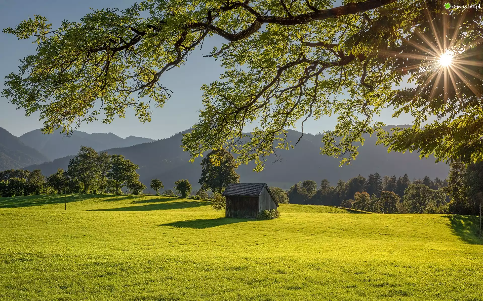 Zdjęcie, Góry, Łąka, Drzewa, Szopa, Promienie słońca