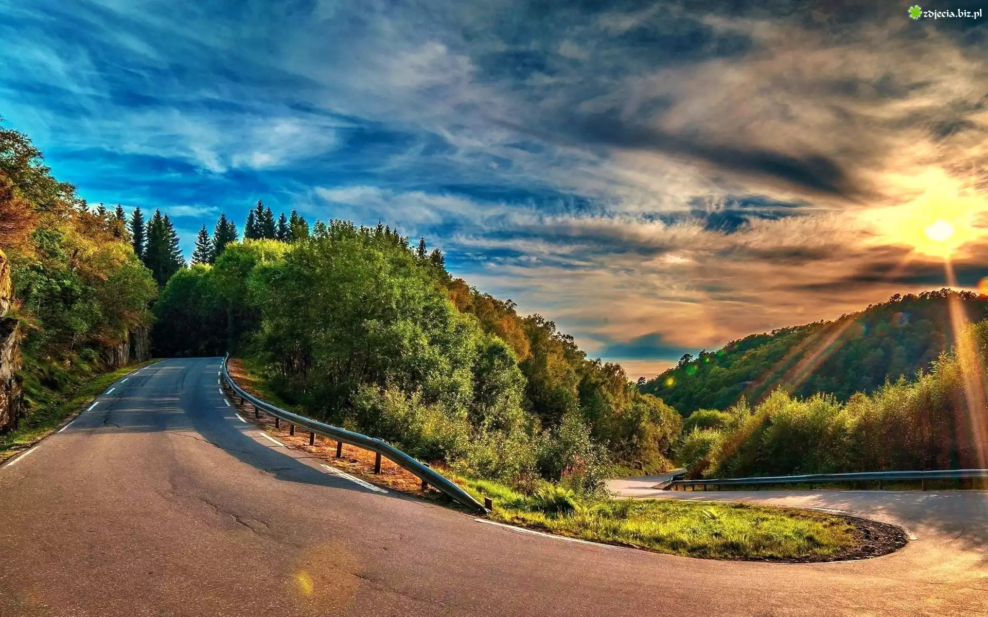 Zdjęcie Góry, Droga, Zakręt, Lasy, Promienie, Słońca