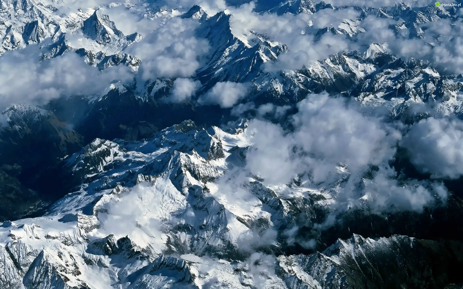 Zdjęcie Góry, Szczyty, Obłoki, Zima, Przebijające, Światło