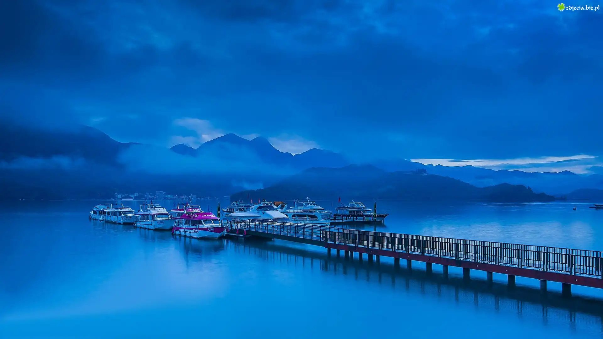 Zdjęcie Góry, Mgła, Pomost, Przystań, Łodzie