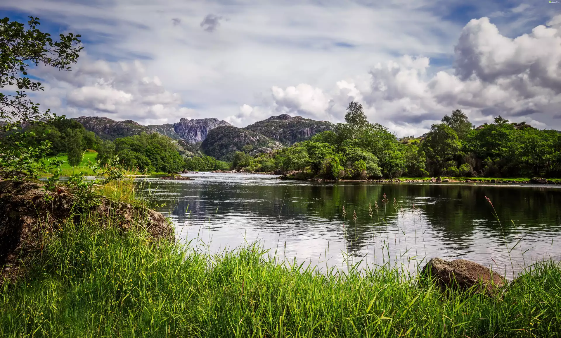 Zdjęcie, Góry, Jezioro, Drzewa, Chmury, Roślinność, Kamienie