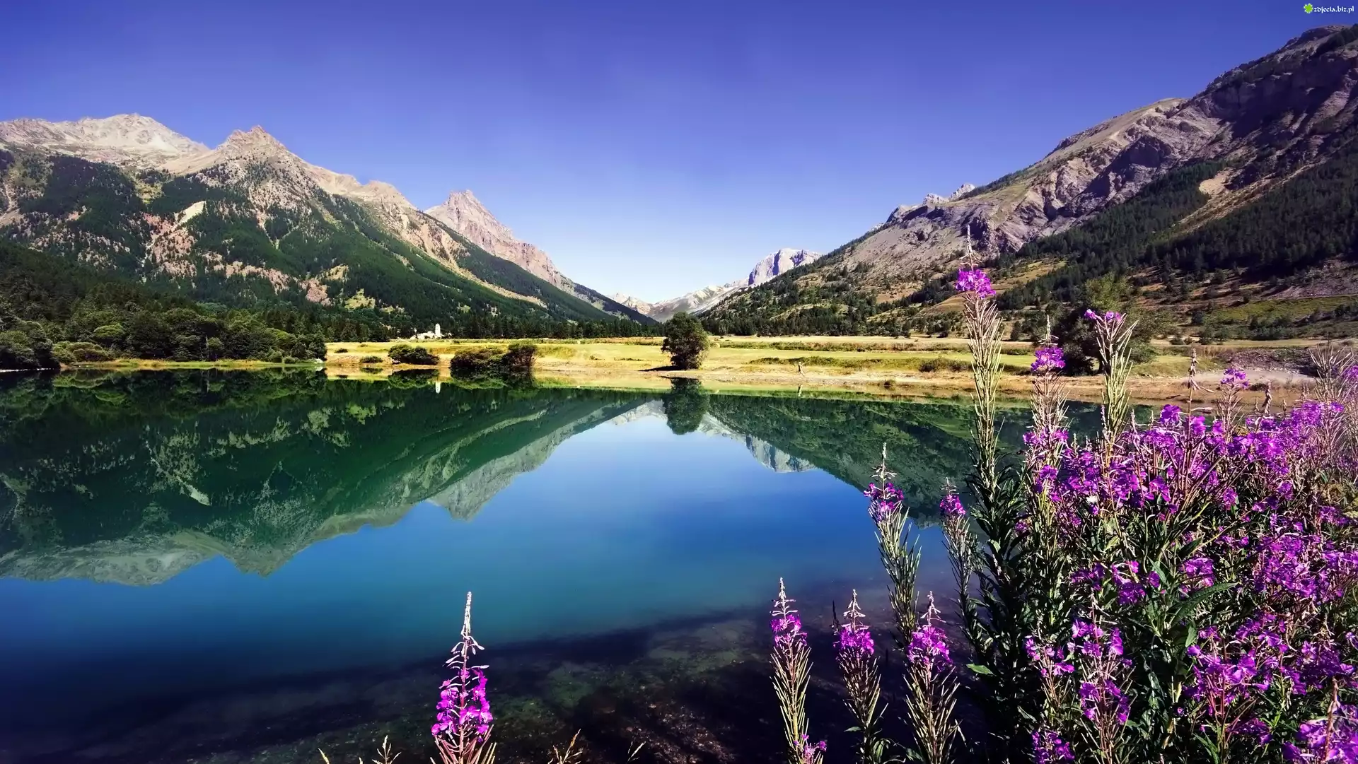 Zdjęcie, Góry, Jezioro, Kwiaty, Roślinność, Odbicie