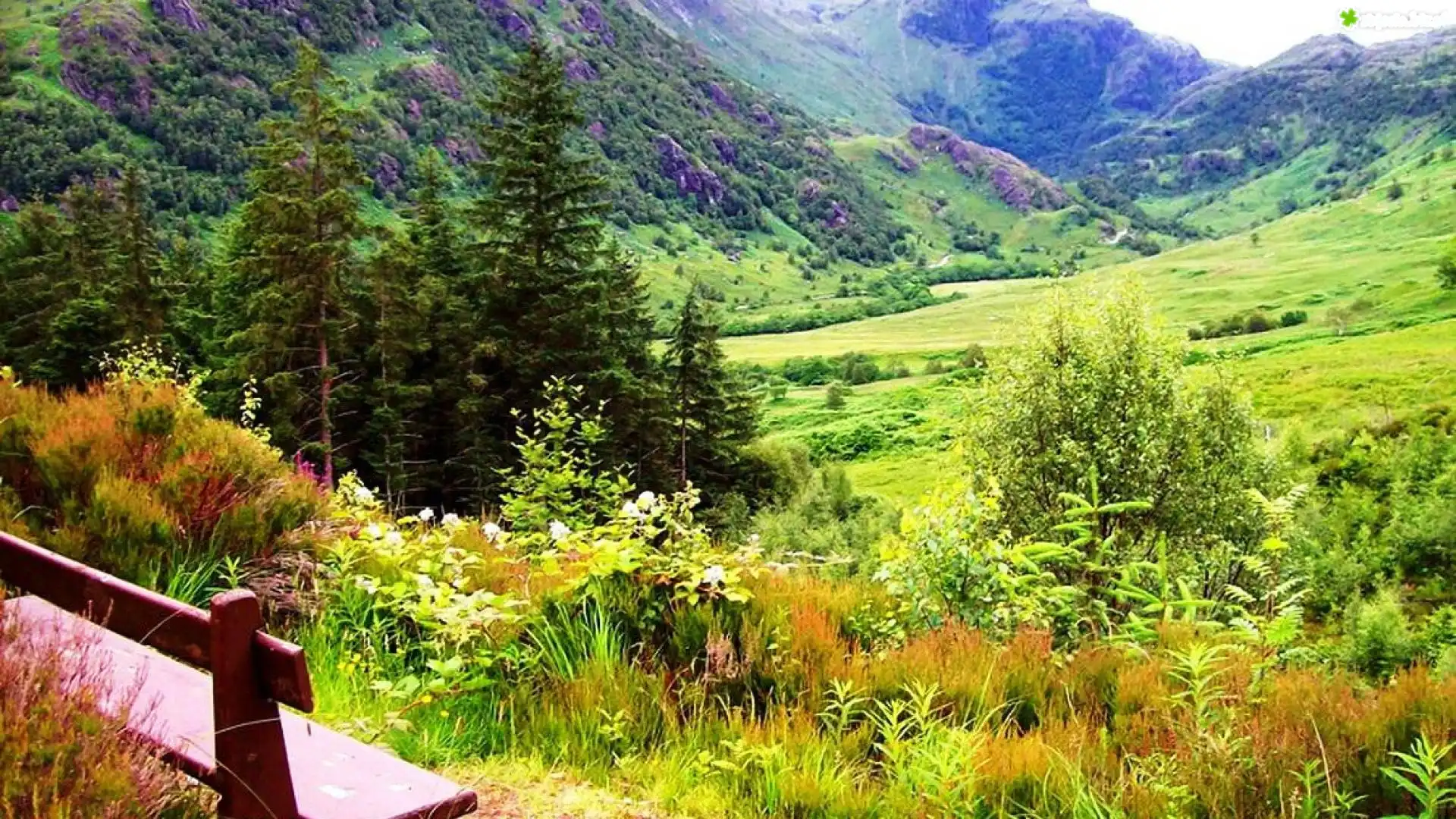 Zdjęcie Góry, lasy, Roślinność, Ławeczka