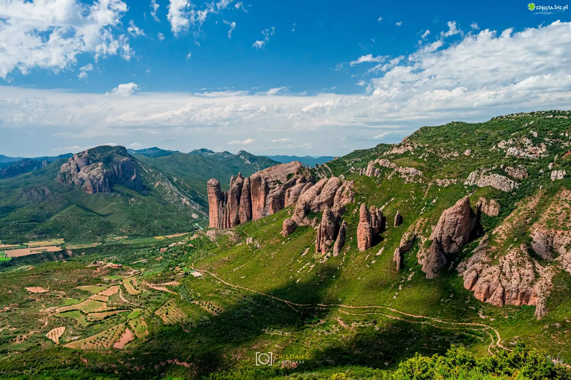 Zdjęcie, Góry, Skały, Formacje skalne, Mallos de Riglos, Dolina, Rośliny, Hiszpania