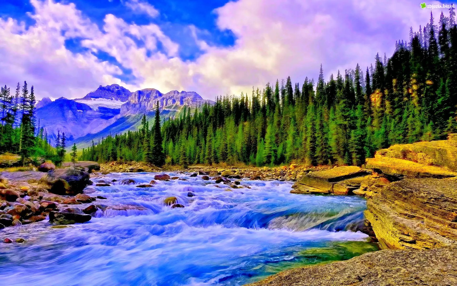 Zdjęcie Góry, Chmury, Rzeka, Choinki