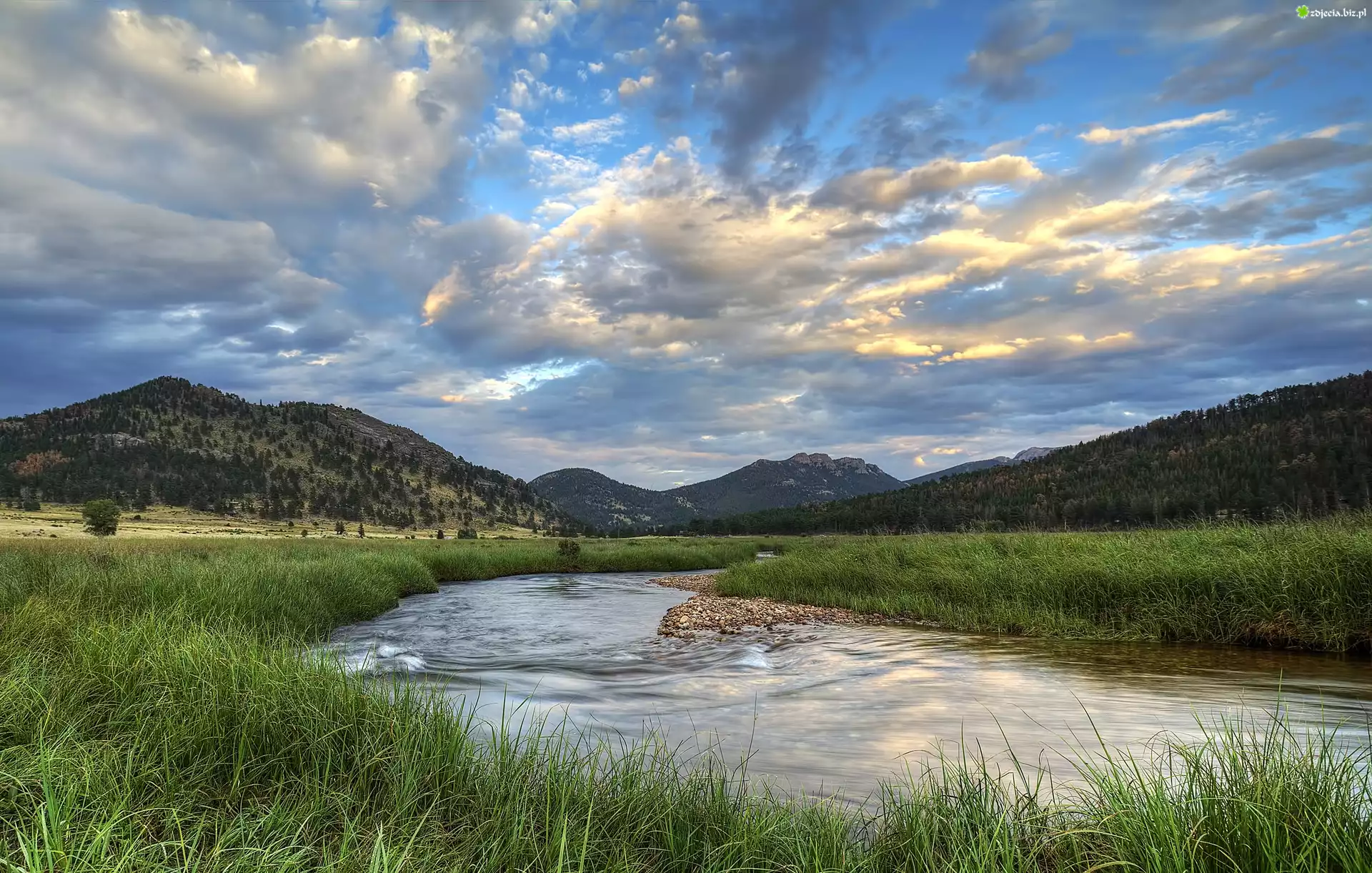 Zdjęcie Góry, Zachmurzone, Niebo, Rzeka, Łąki