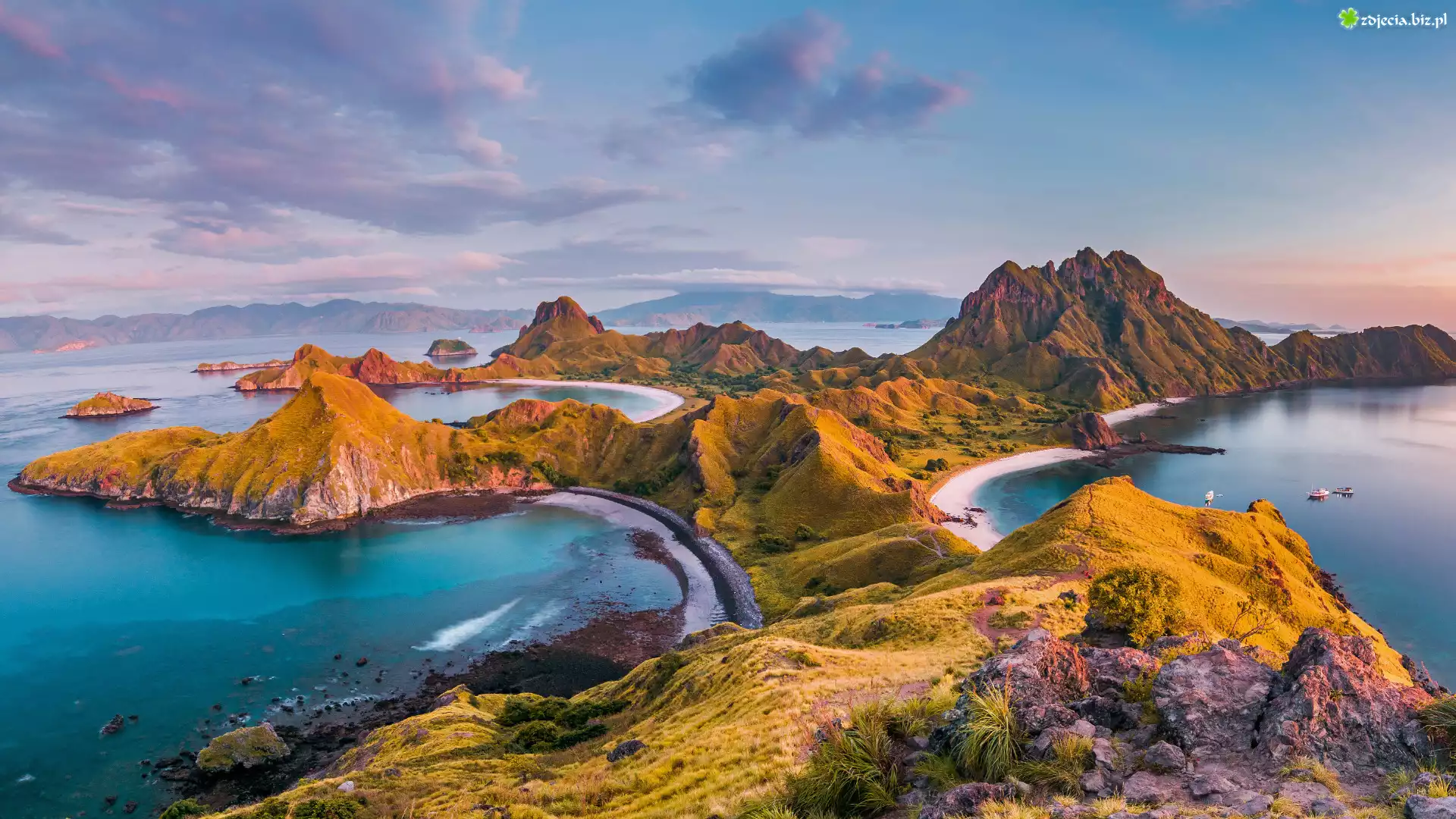 Zdjęcie Indonezja, Wyspa Bali, Park Narodowy Komodo, Góry, Skały, Rośliny, Morze, Łódź