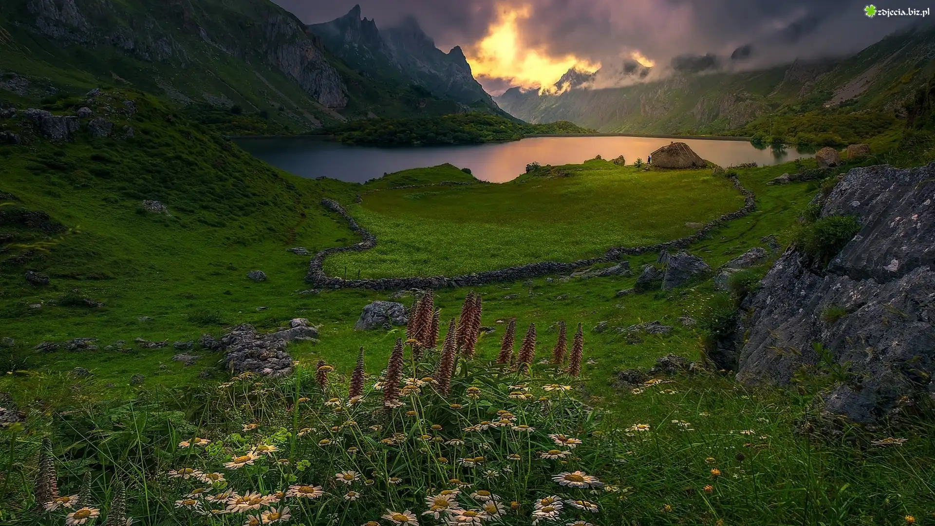 Zdjęcie, Góry, Jezioro, Kwiaty, Rośliny, Skały, Łąka