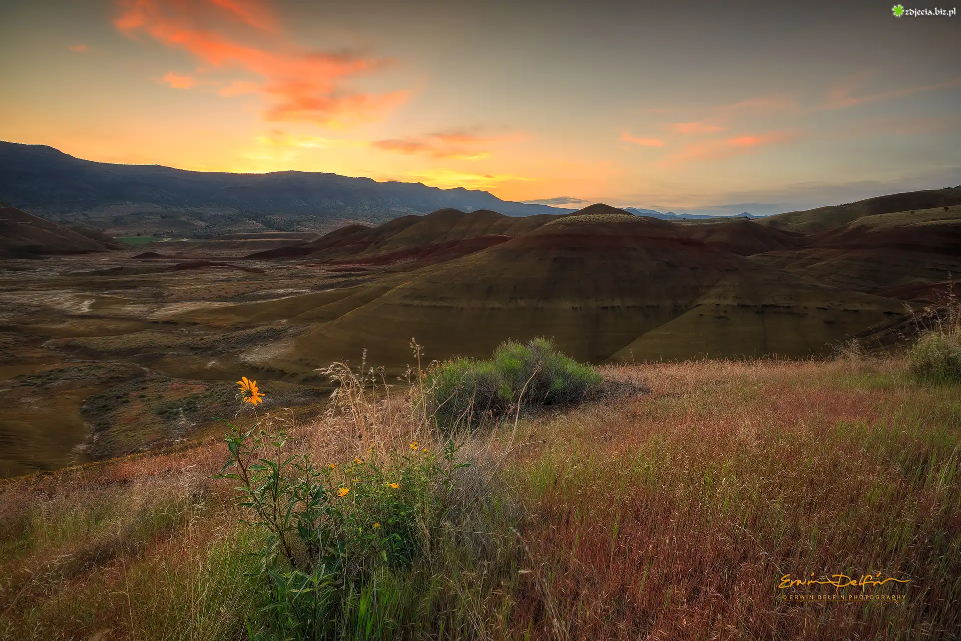 Zdjęcie Góry, Góra Painted Hills, Roślinność, Wschód słońca, Park Narodowy John Day Fossil Beds National Monument, Stan Oregon, Stany Zjednoczone |
