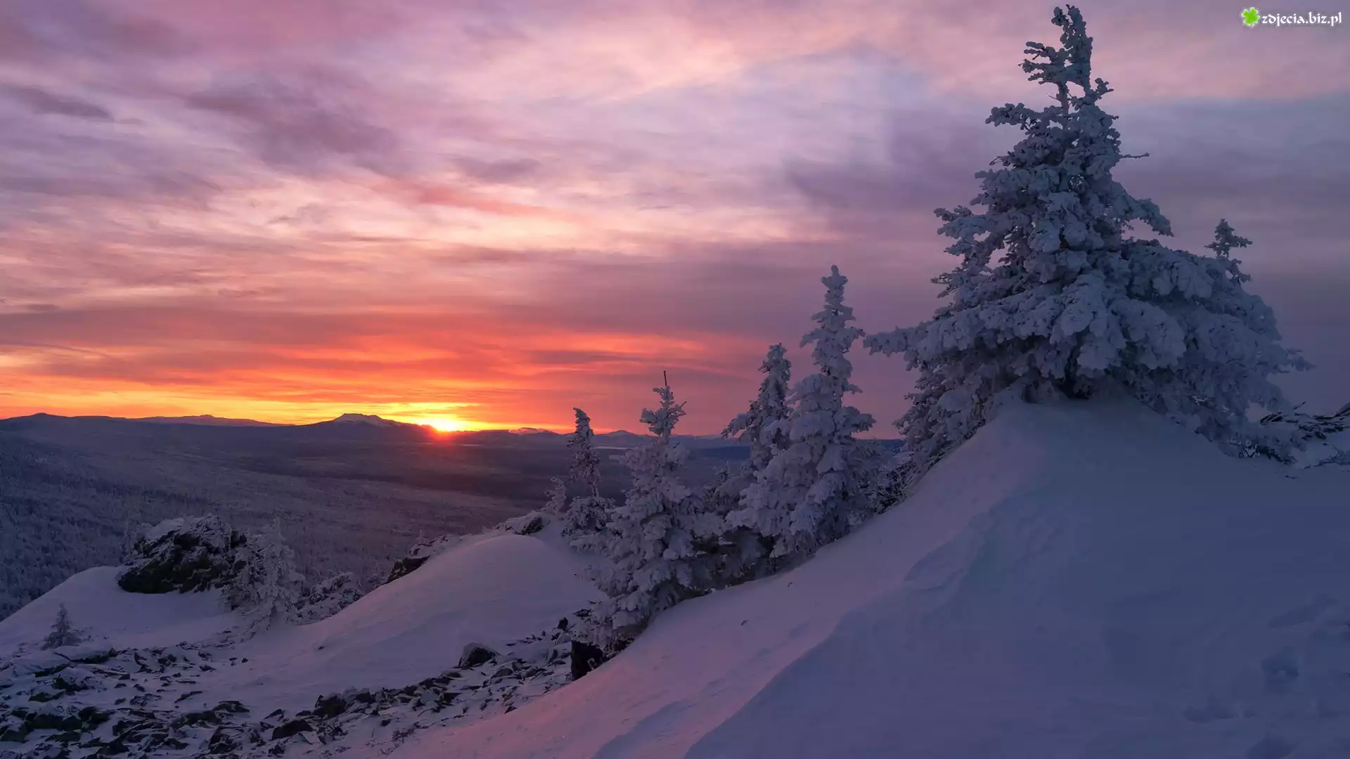 Zdjęcie Góry, Drzewa, Świerki, Zachód słońca, Zima