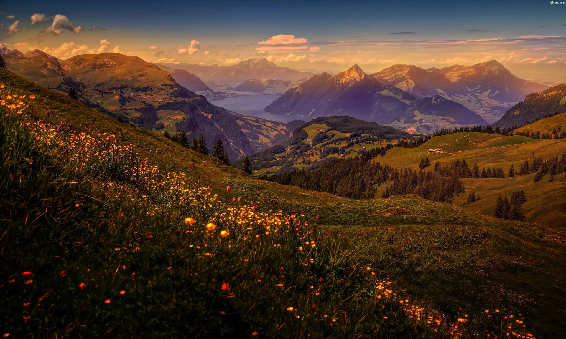 Zdjęcie, Góry, Wschód słońca, łąka