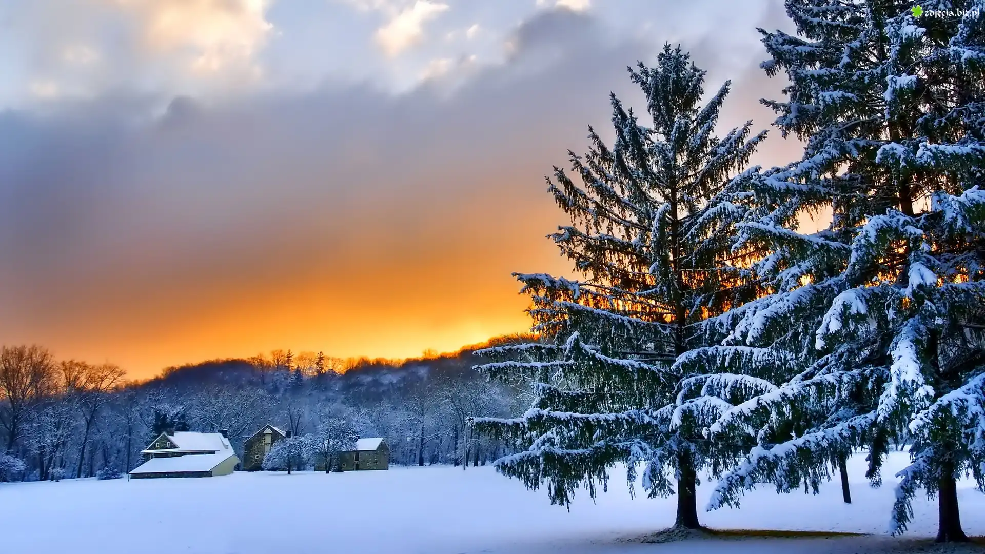 Zdjęcie, Góry, Lasy, Zabudowania, Zachód, Słońca, Zima