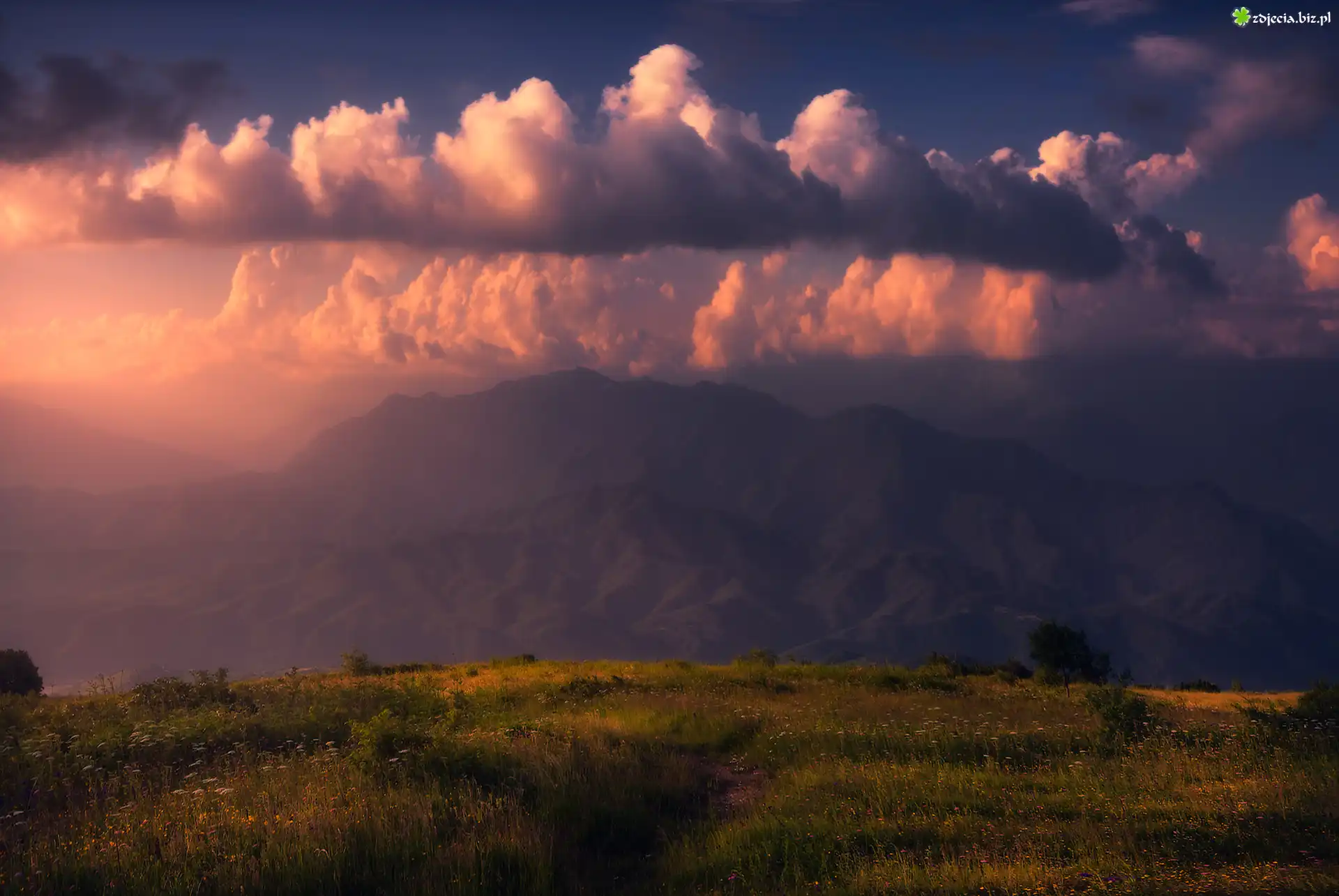 Zdjęcie, Góry, Łąka, Zachód słońca, Chmury
