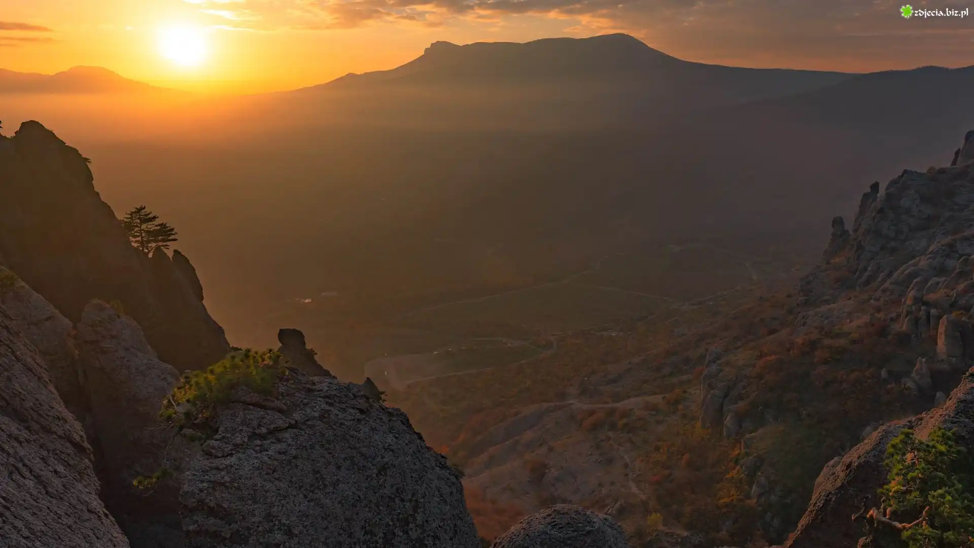 Zdjęcie Góry, Dolina, Zachód słońca, Iglaki