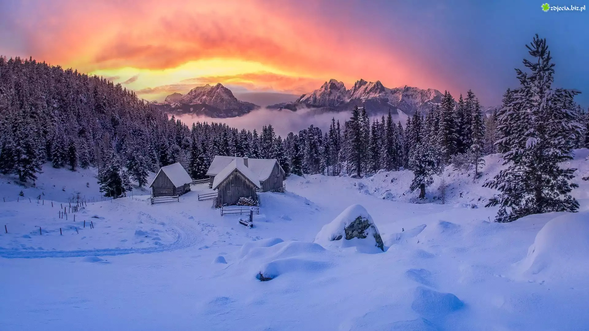 Zdjęcie Zima, Zachód słońca, Góry, Ośnieżone, Drzewa, Domy