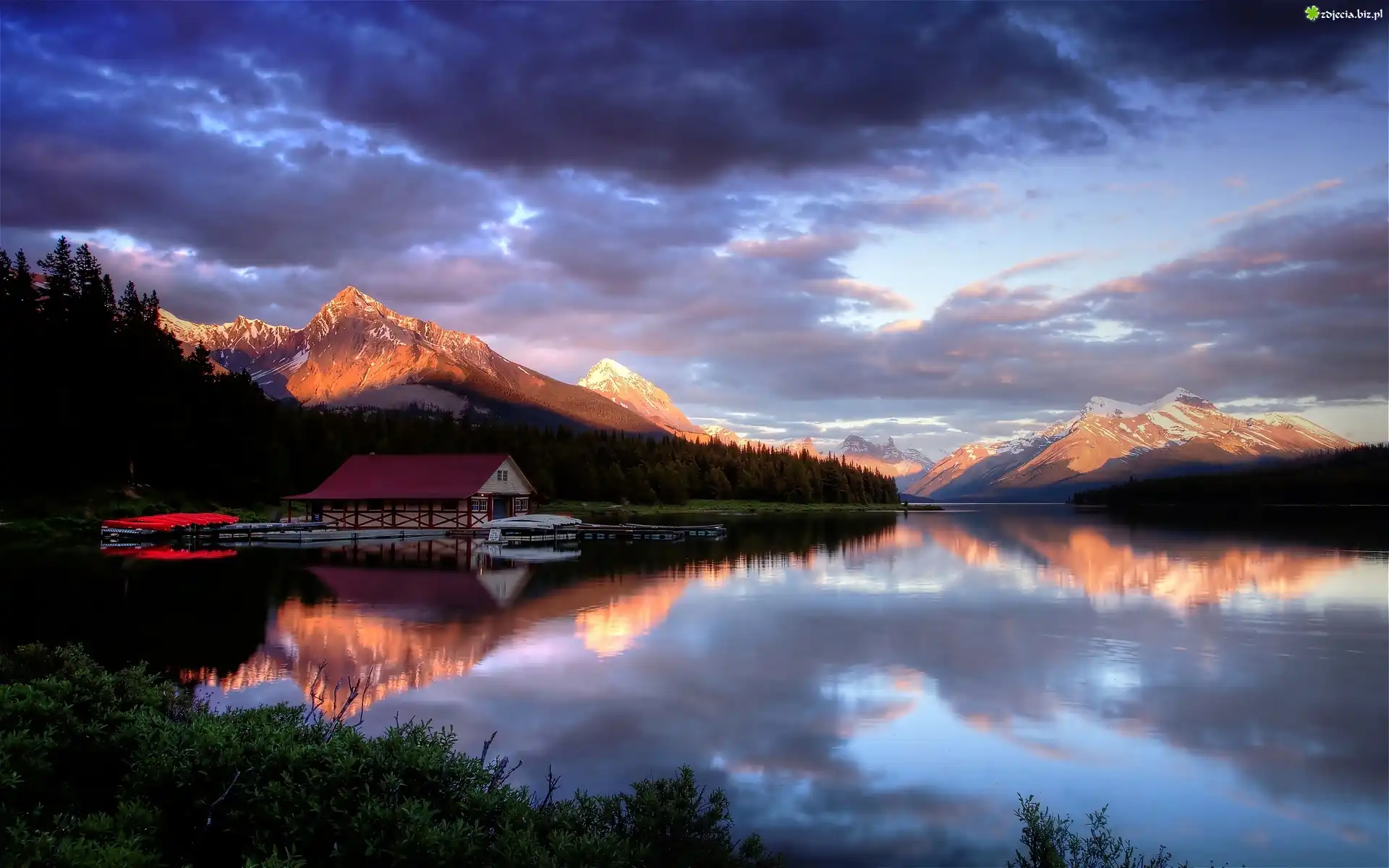 Zdjęcie, Góry, Jezioro, Zachód Słońca, Przystań