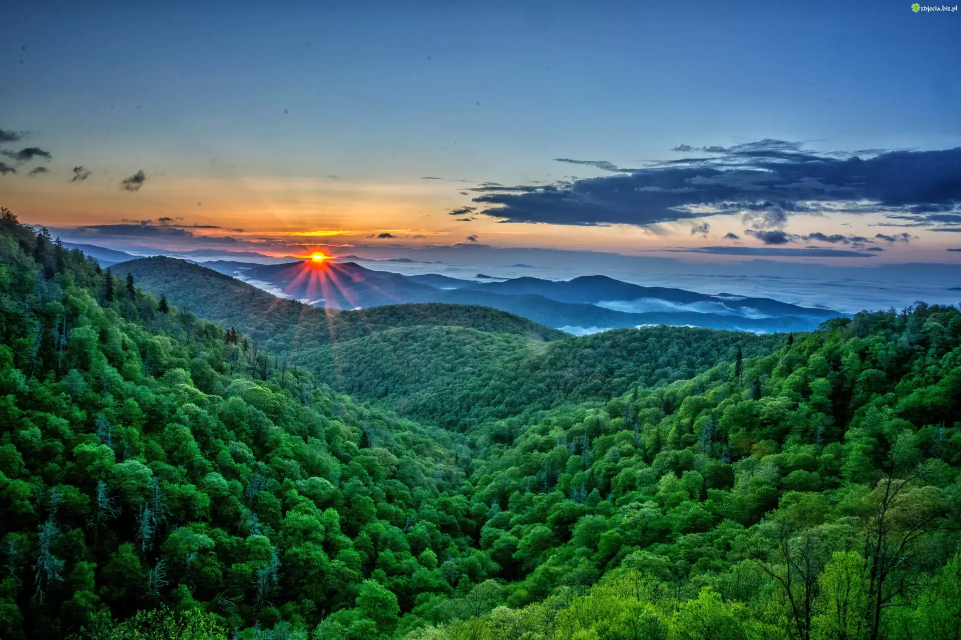 Zdjęcie, Góry, Las, Zachód słońca, Roślinność