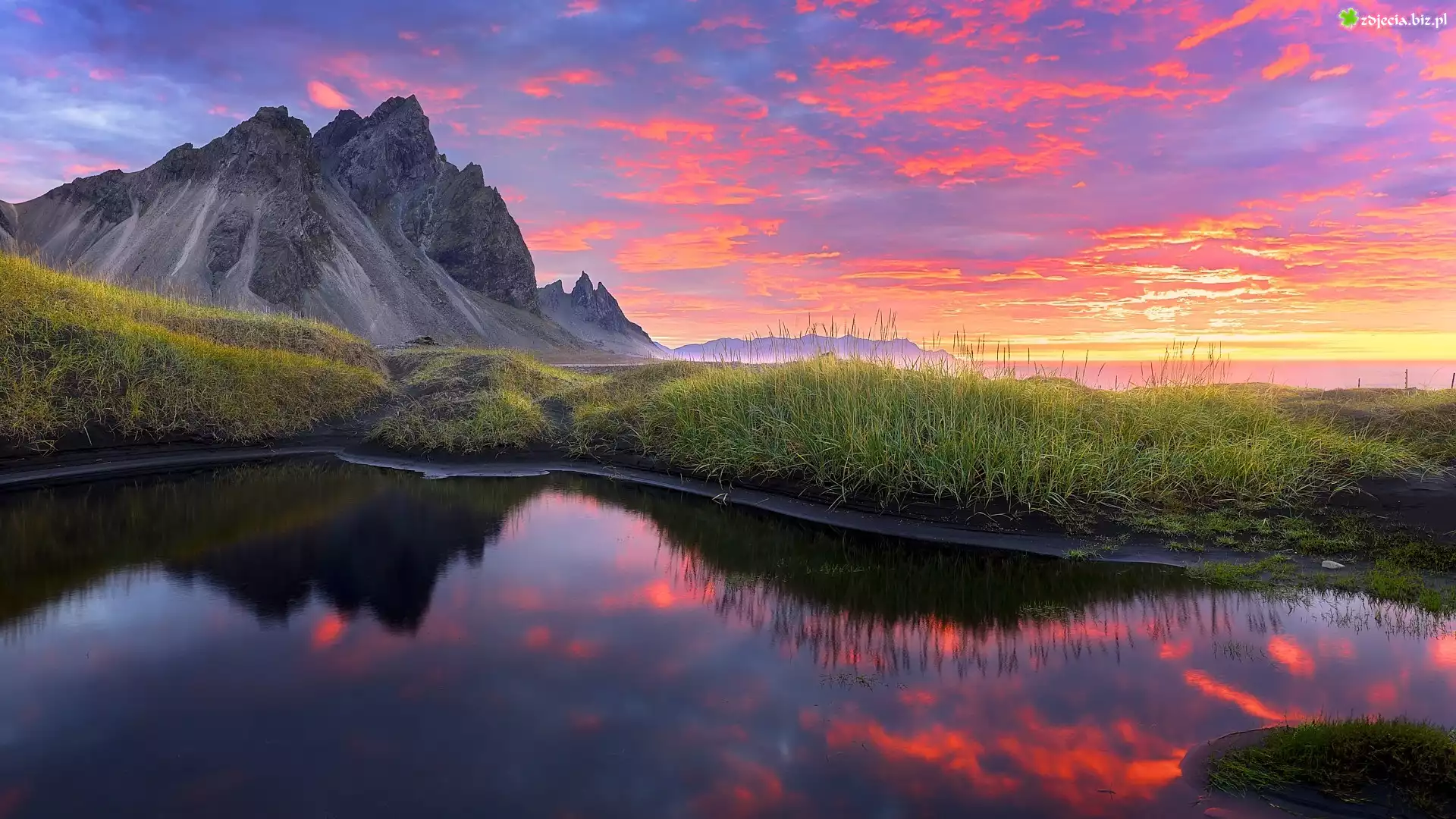 Zdjęcie Góry, Vestrahorn, Kałuża, Różowe, Niebo, Zachód słońca, Trawa, Islandia