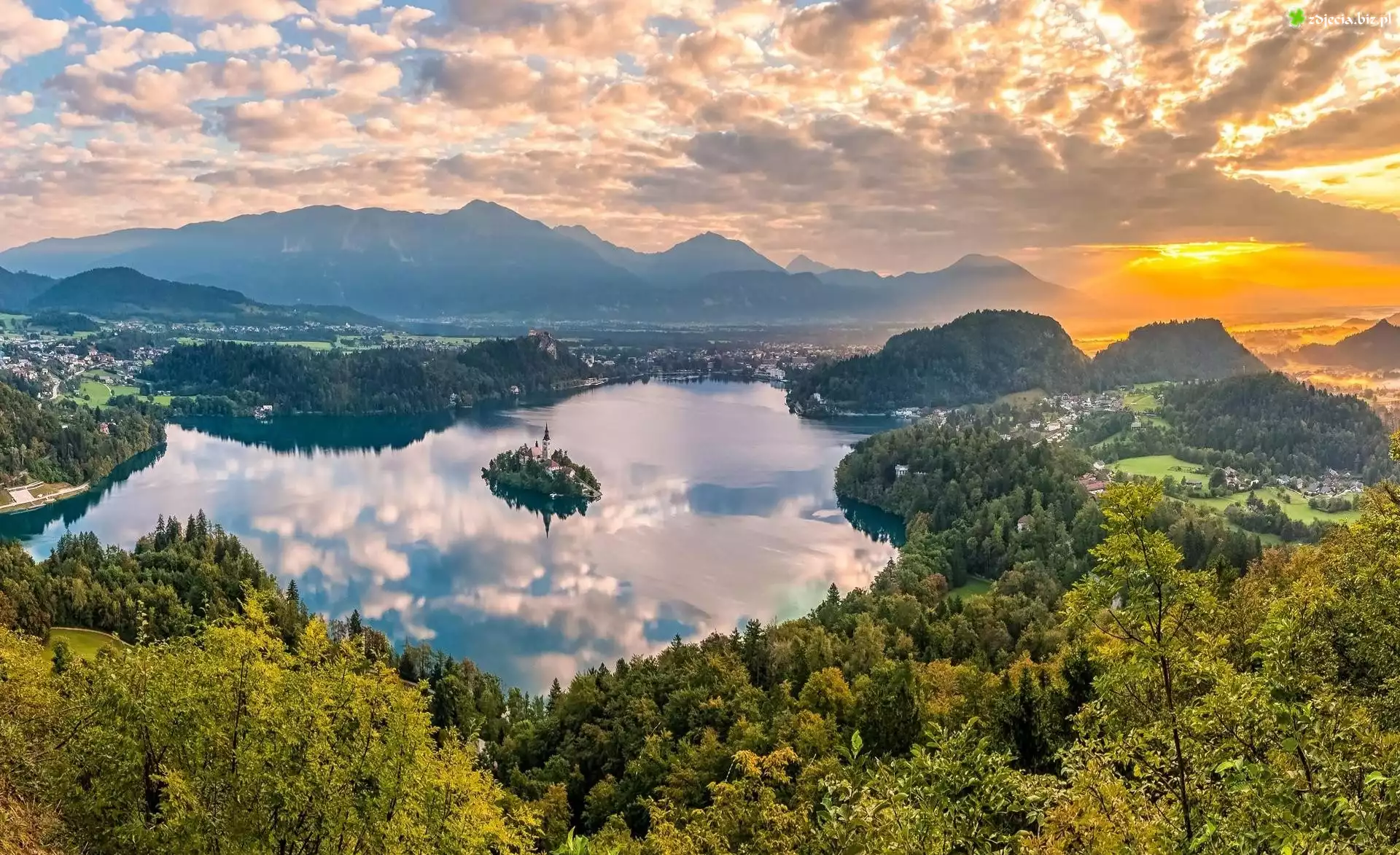 Zdjęcie Słowenia, Wyspa Blejski Otok, Góry Alpy Julijskie, Jezioro Bled, Las, Zachód słońca, Chmury, Drzewa |