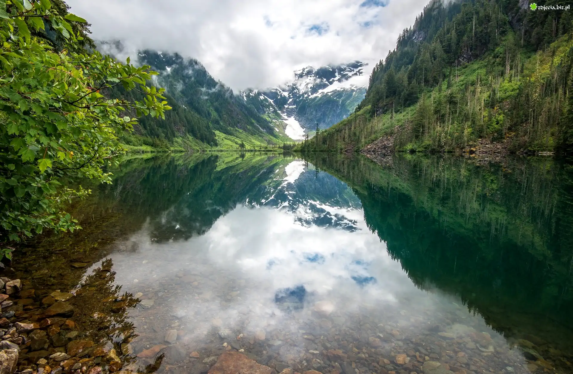 Zdjęcie Góry, Jezioro Goat Lake, Drzewa, Odbicie, Kamienie, Park Narodowy Północnych Gór Kaskadowych, Stan Waszyngton, Stany Zjednoczone |
