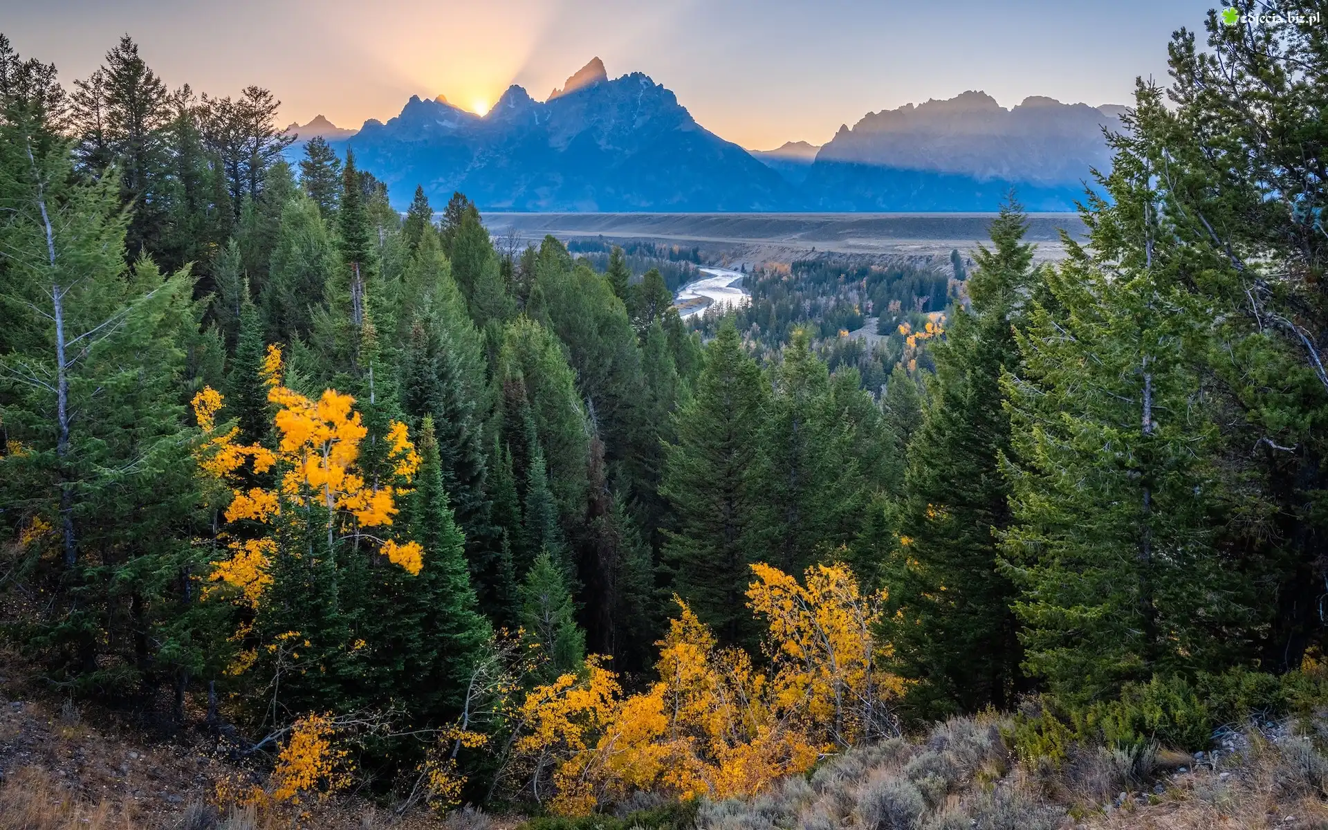 Zdjęcie Góry, Teton Range, Rzeka, Snake River, Drzewa, Park Narodowy Grand Teton, Stan Wyoming, Stany Zjednoczone |