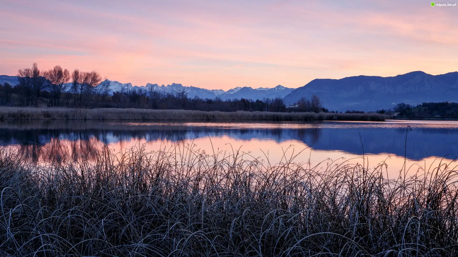 Zdjęcie Góry, Drzewa, Trawa, Szuwary, Jezioro