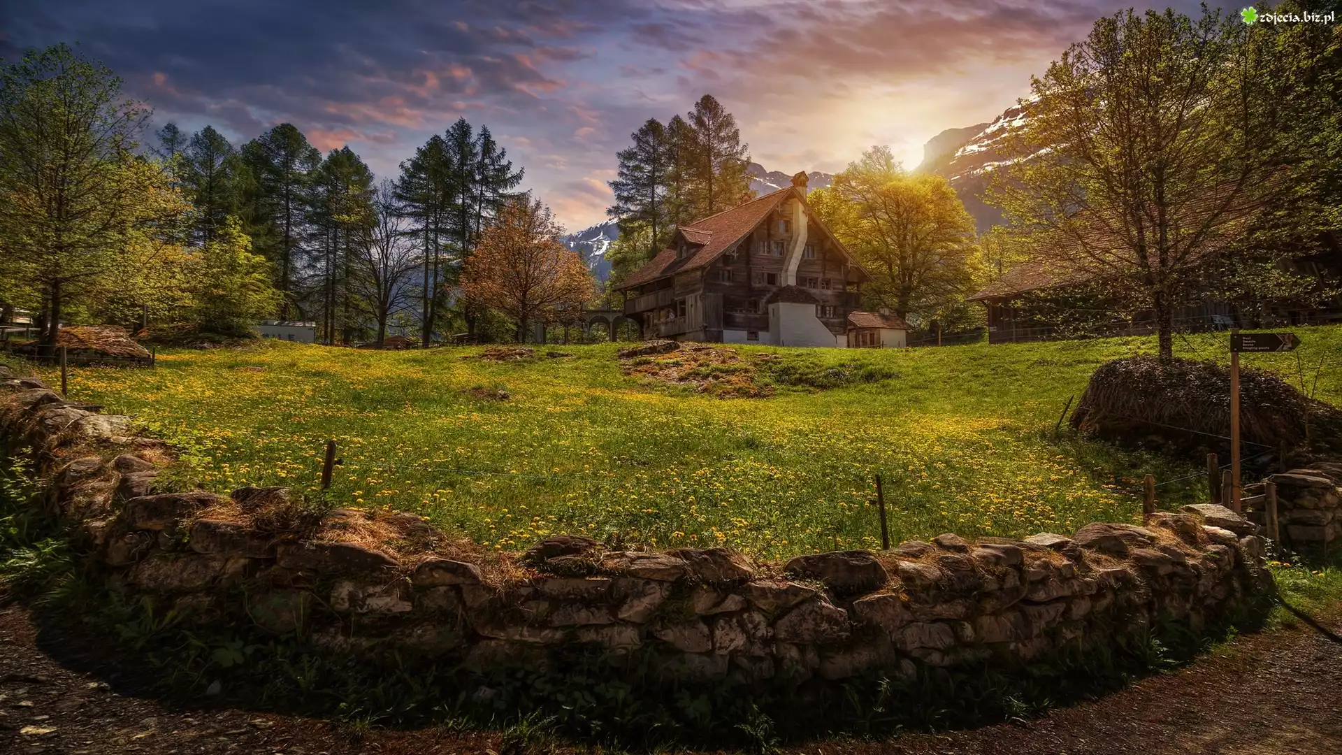Zdjęcie Szwajcaria, Wioska Ballenberg, Skansen Ballenberg, Góry, Dom, Murek, Drzewa, Wschód słońca, Chmury |