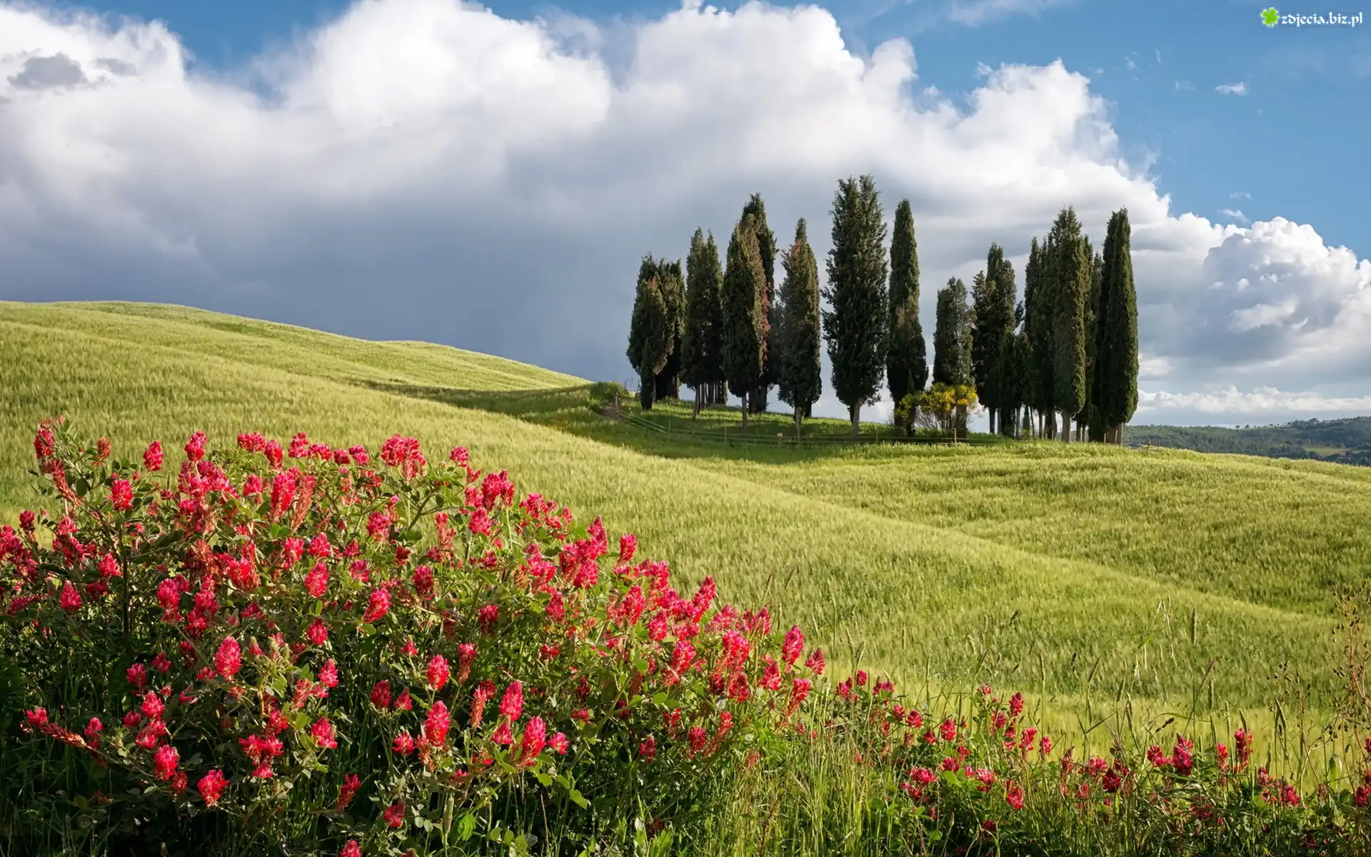 Zdjęcie Góry, Łąki, Kwiaty, Drzewa, Toskania, Włochy