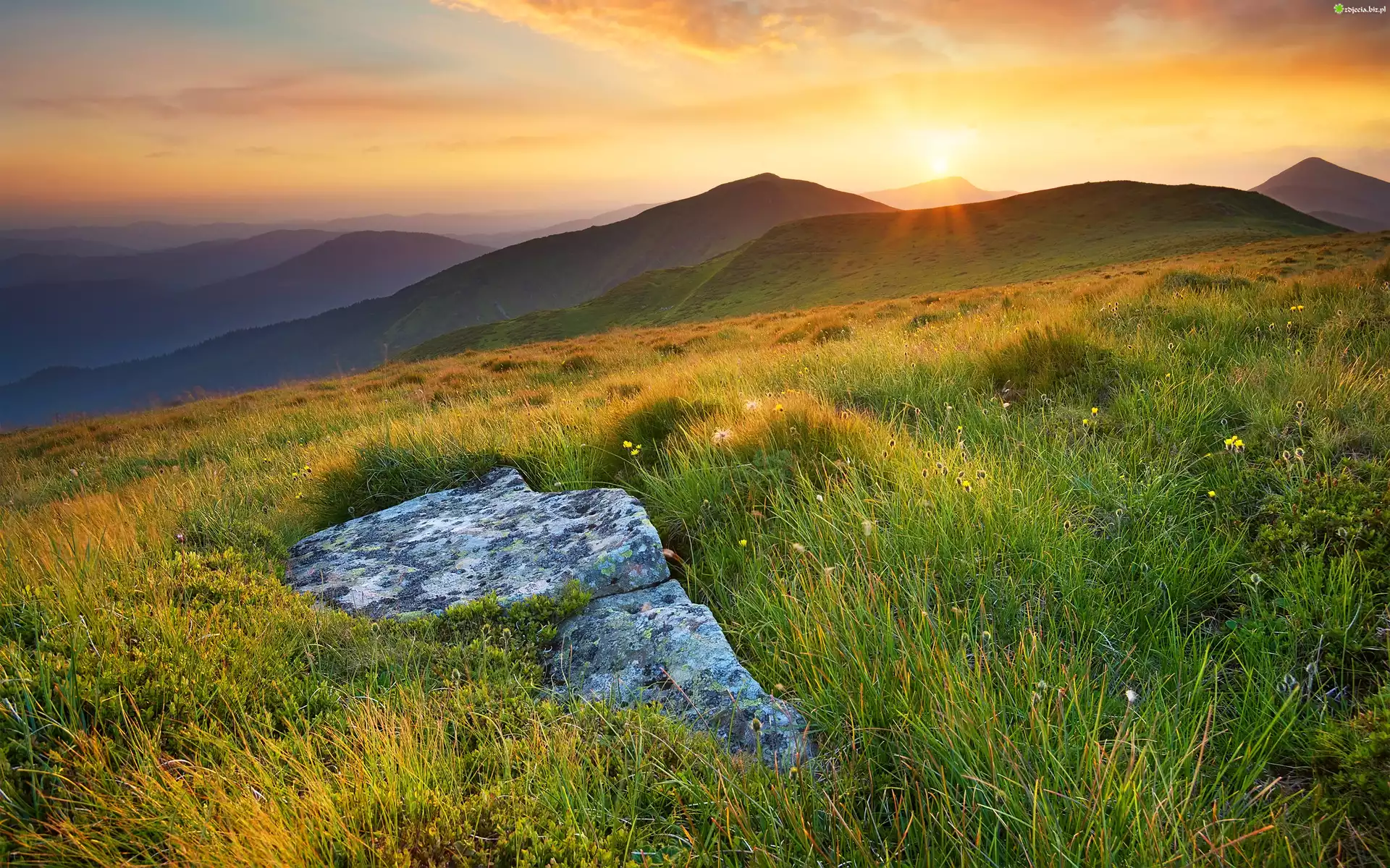 Zdjęcie, Góry, Zachód, Słońca, Trawa, Kamienie