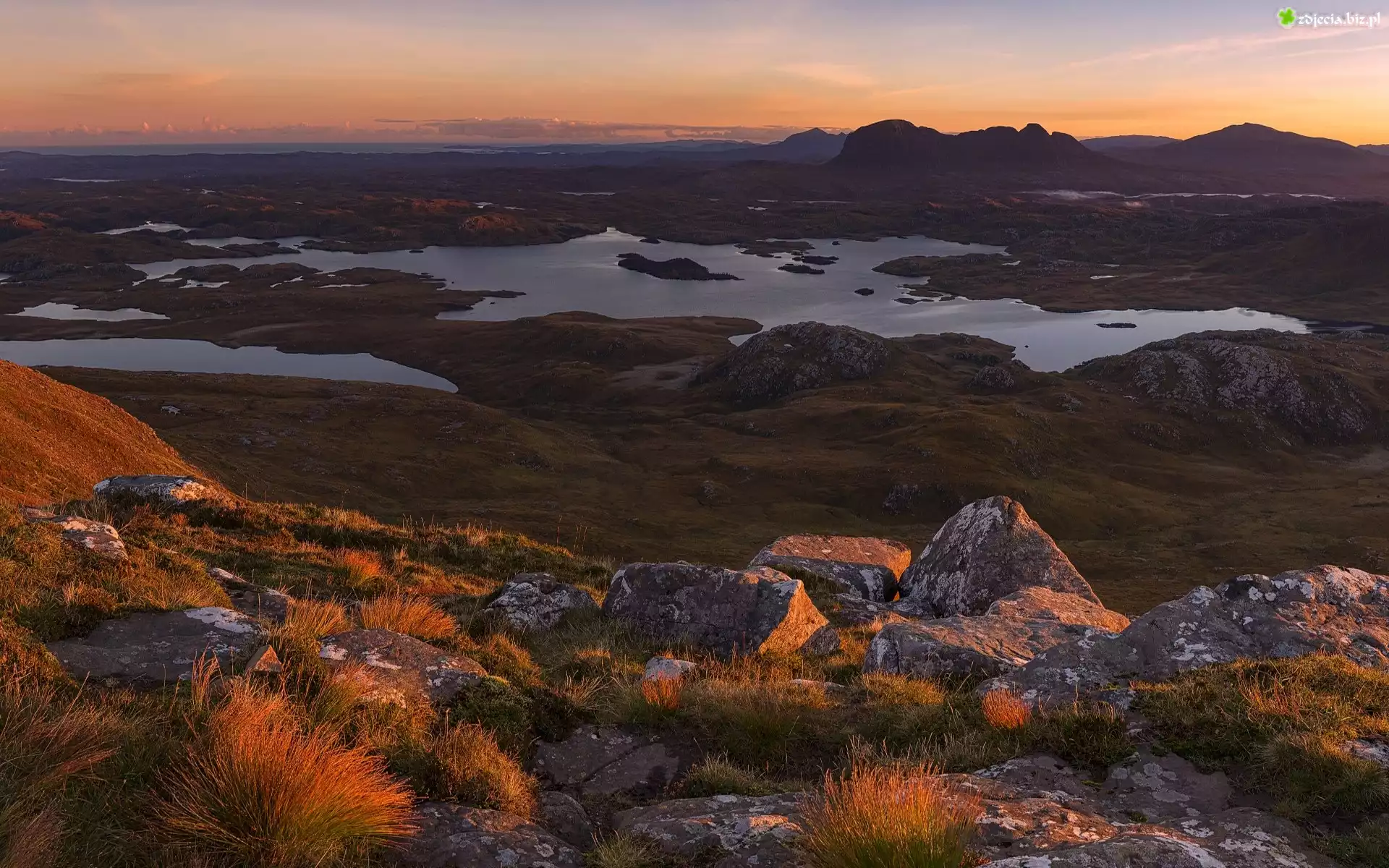 Zdjęcie, Szkocja, Góry Kaledońskie, Jezioro Loch Sionascaig, Kamienie, Trawa