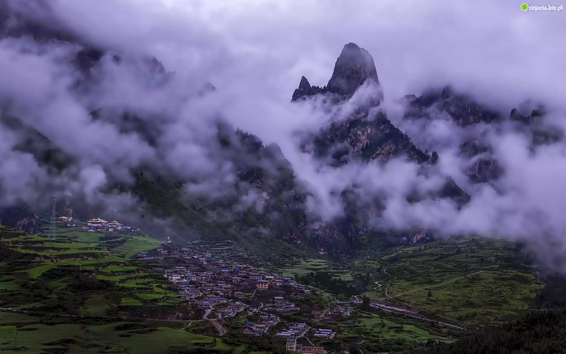 Zdjęcie Góry, Chmury, Miasteczko, Tybet, Chiny