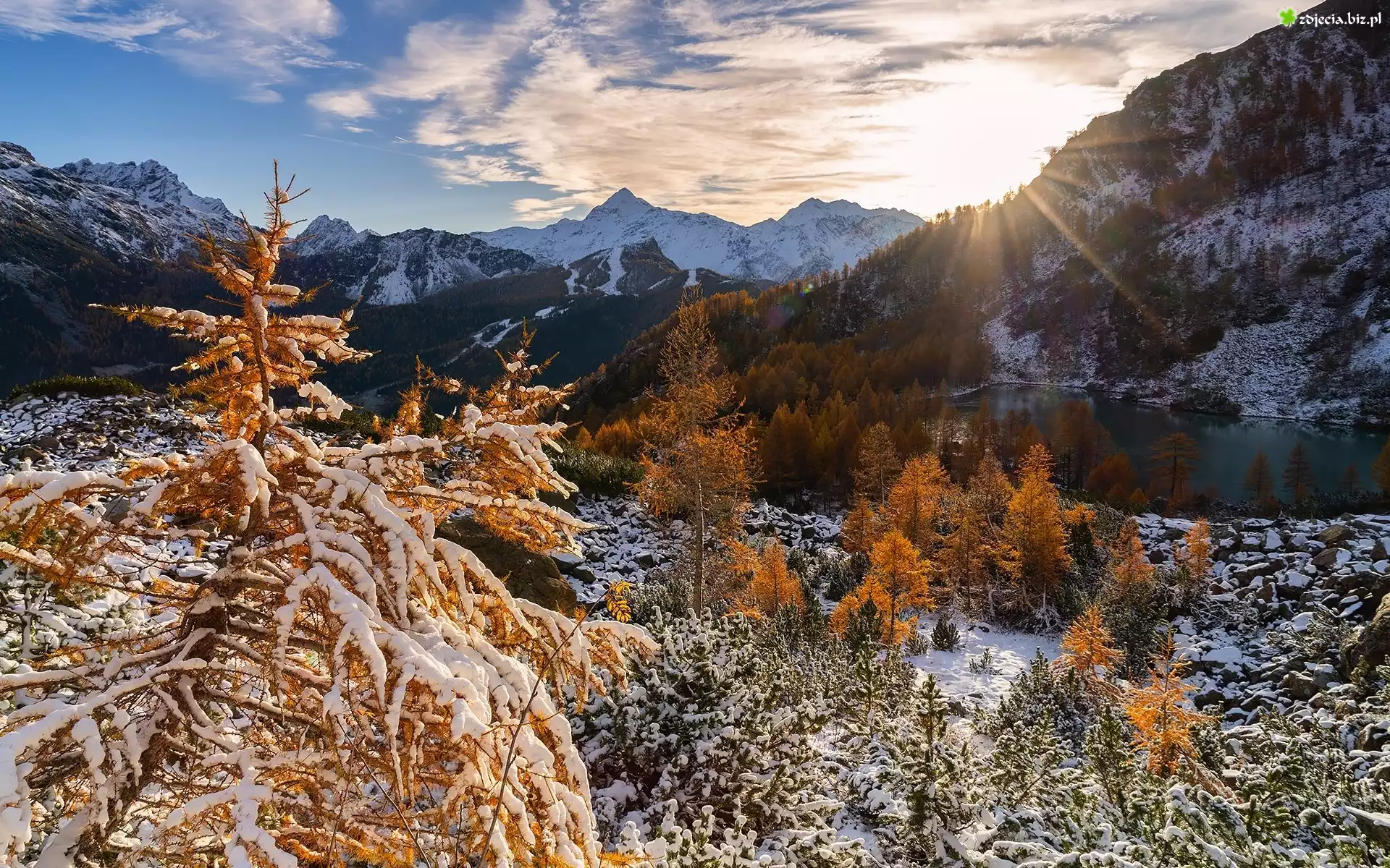 Zdjęcie, Góry, Las, Drzewa, Jezioro, Lago Lagazzuolo, Wschód słońca, Valmalenco, Włochy