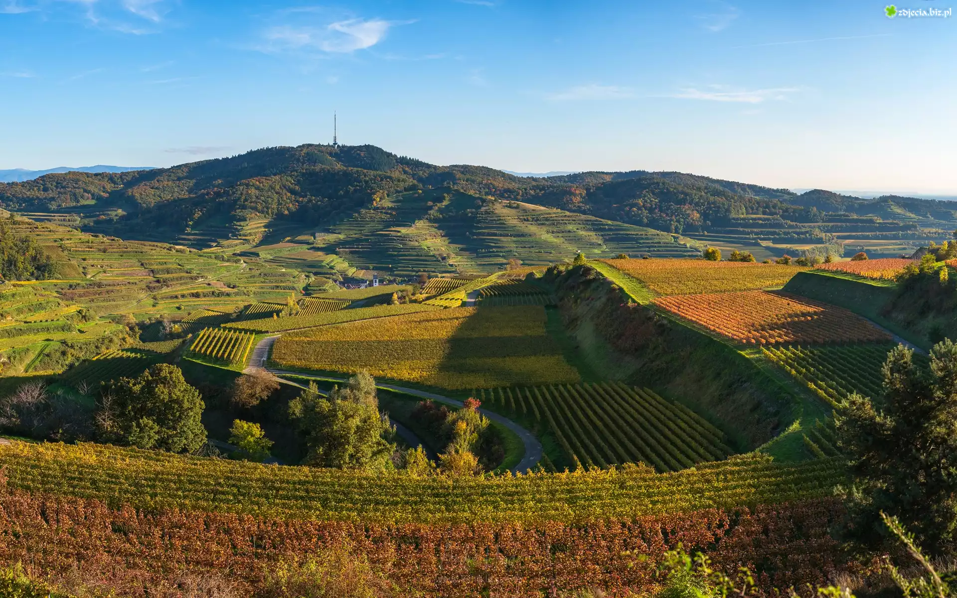 Zdjęcie Góry, Wzgórza, Droga, Pola, Winnice, Drzewa, Vogtsburg Kaiserstuhl, Niemcy