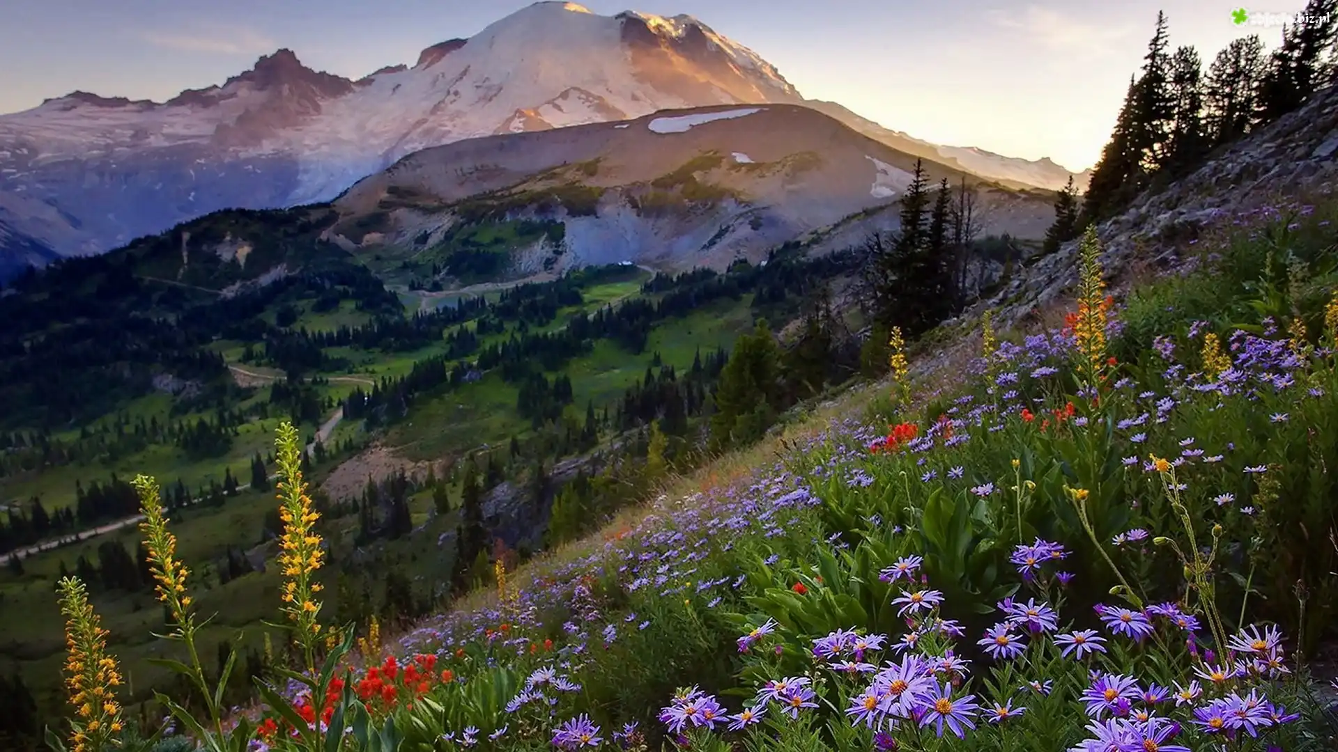 Zdjęcie Góry, Lasy, Łąka, Kwiaty, Światło, Cień