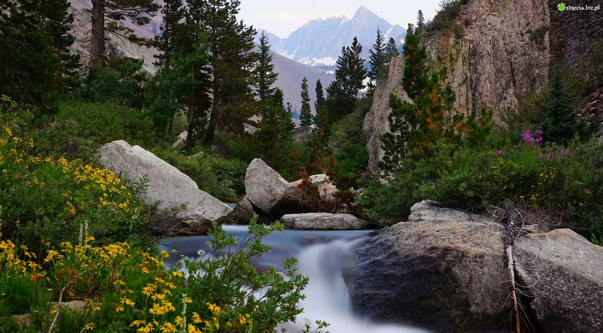 Zdjęcie Góry, Skały, Kamienie, Rzeczka, Świerki, Rośliny