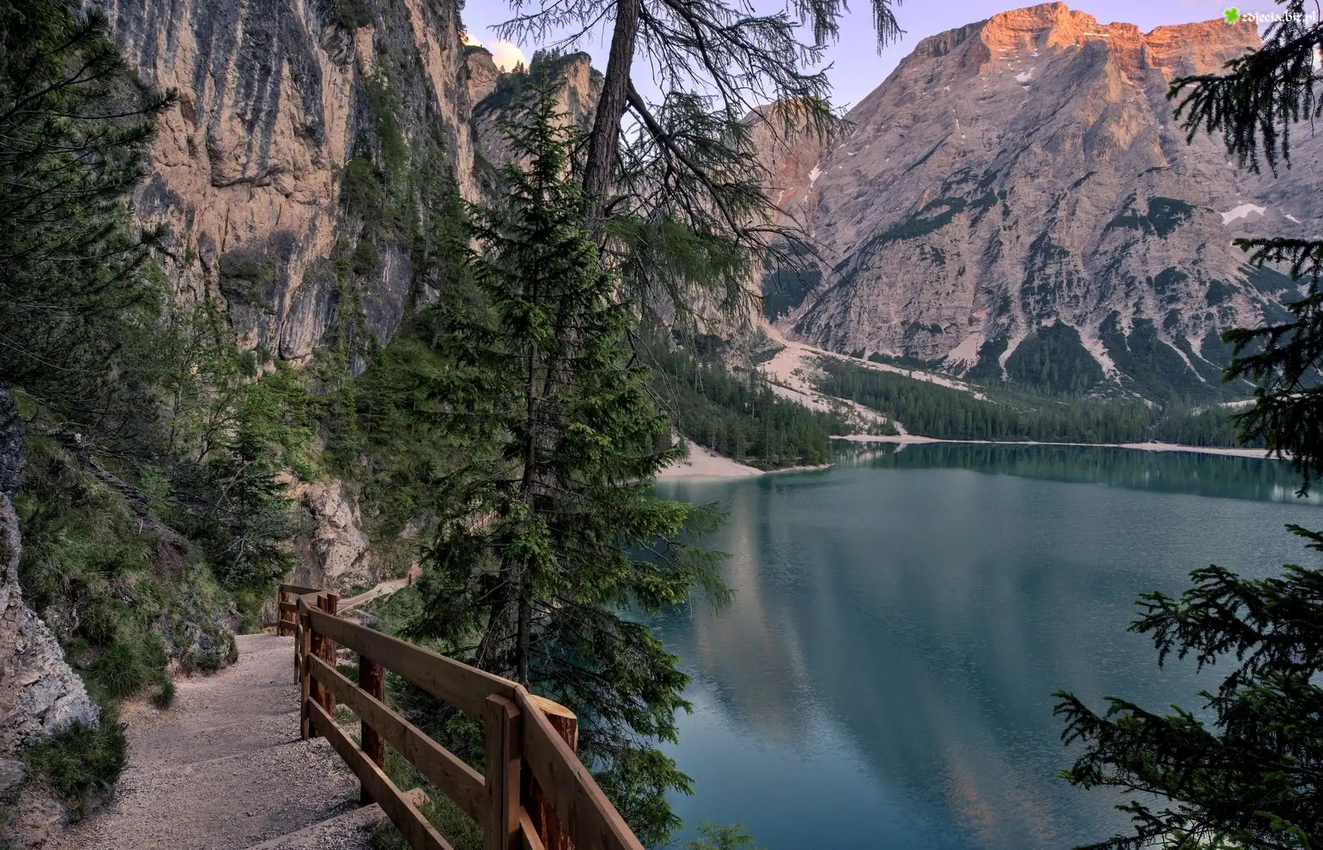 Zdjęcie, Włochy, Góry, Jezioro Pragser Wildsee, Dróżka, Barierka, Świerki