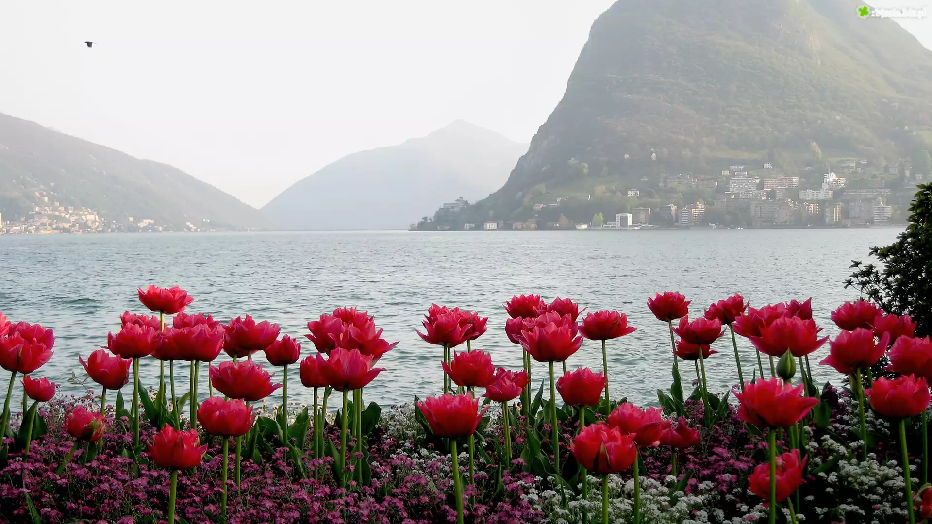 Zdjęcie Góry, Budynki, Woda, Kwiaty