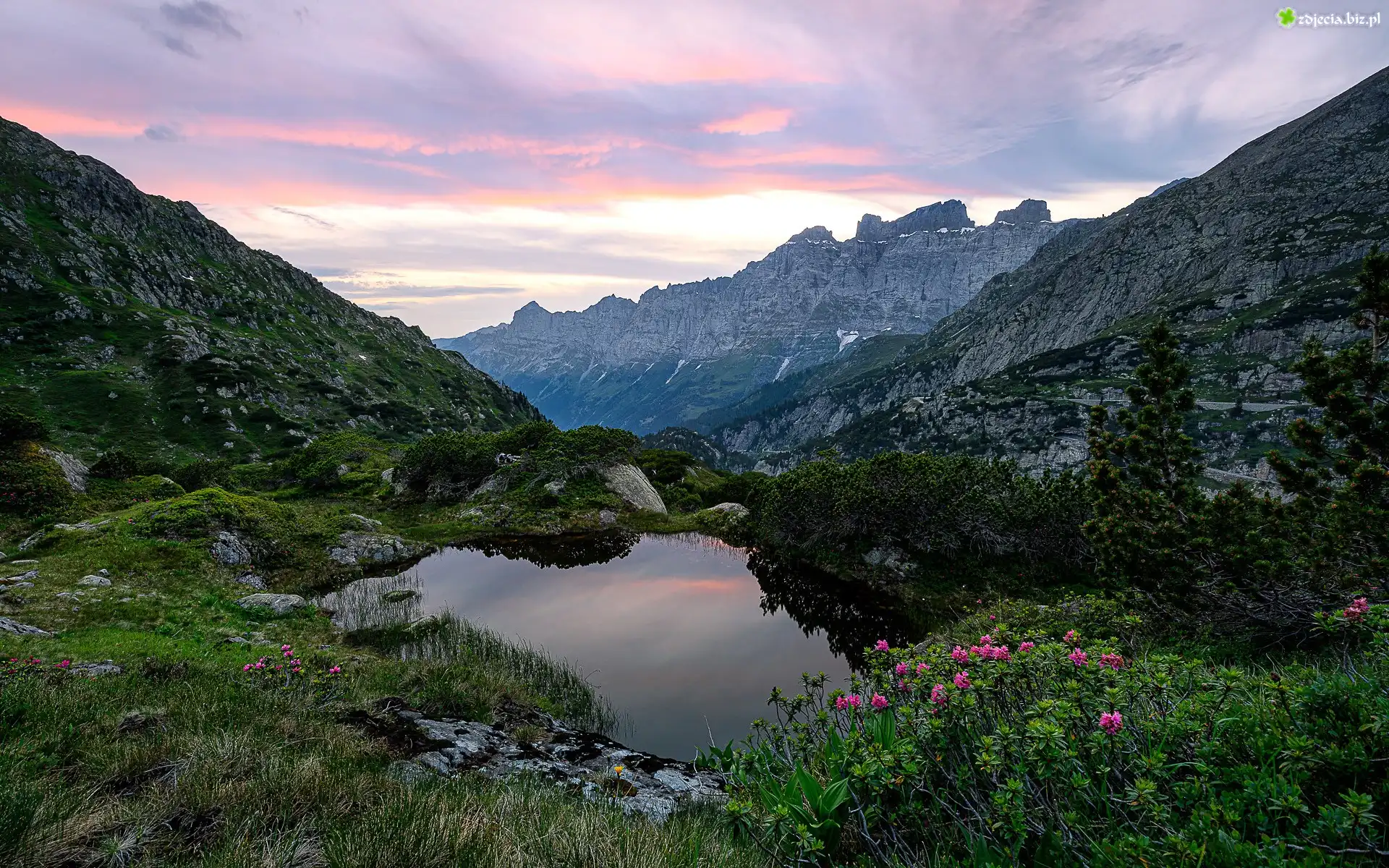 Zdjęcie Góry, Drzewa, Kwiaty, Różanecznik, Woda, Kałuża