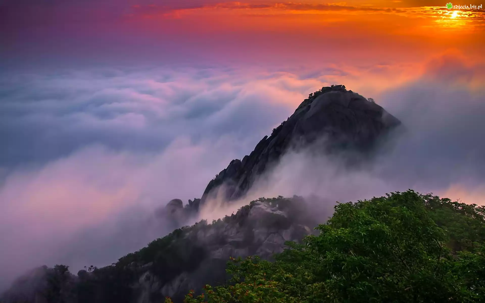 Zdjęcie Góry, Roślinność, Chmury, Wschód, Słońca